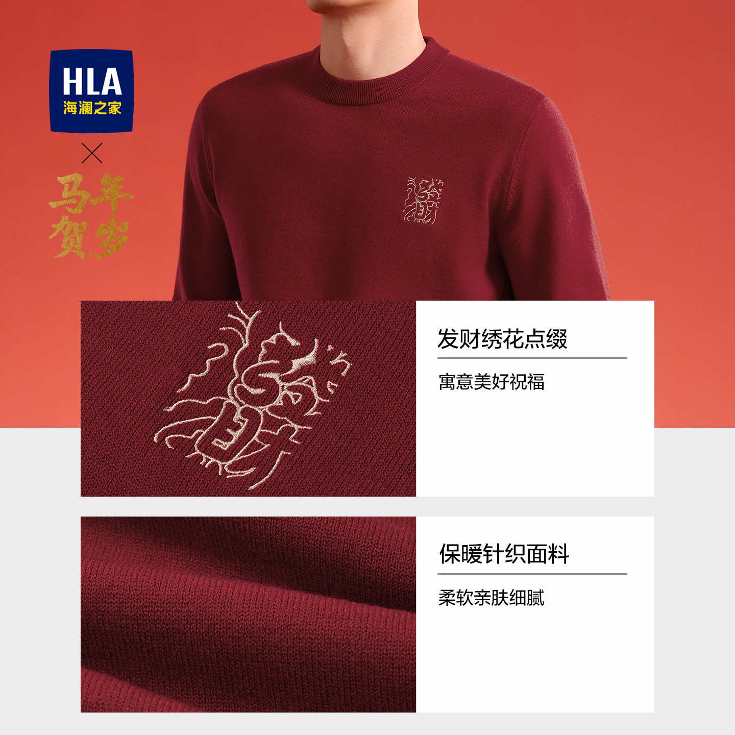 HLA/海澜之家马年贺岁系列针织衫春秋款时尚圆领柔软绣花毛衣男