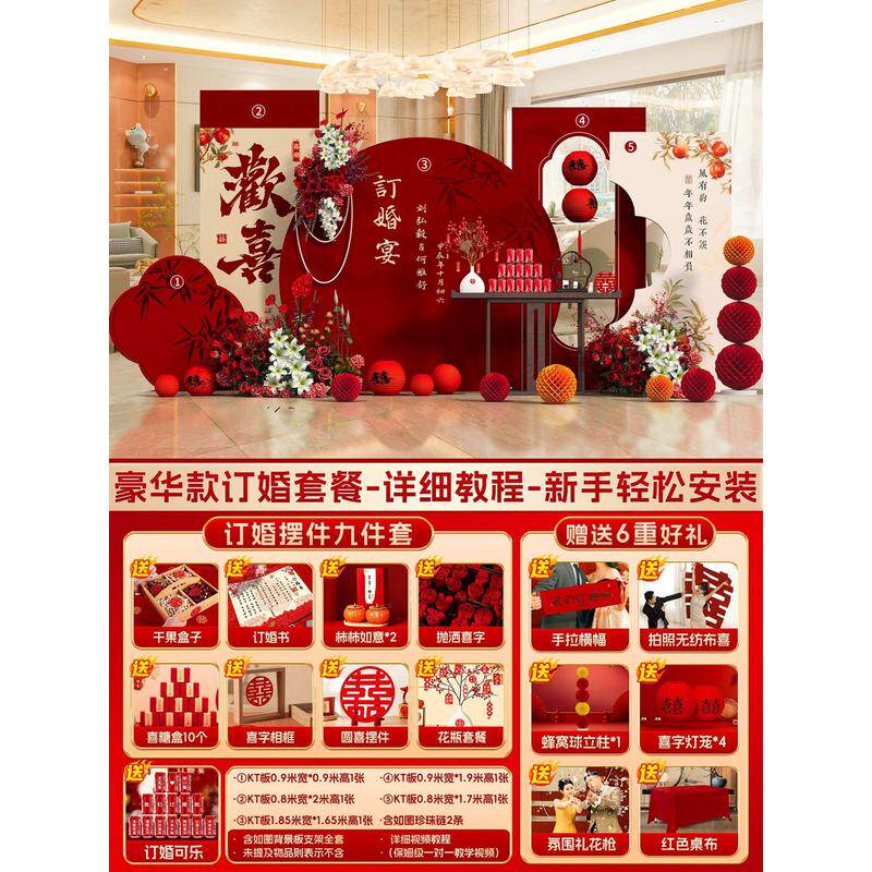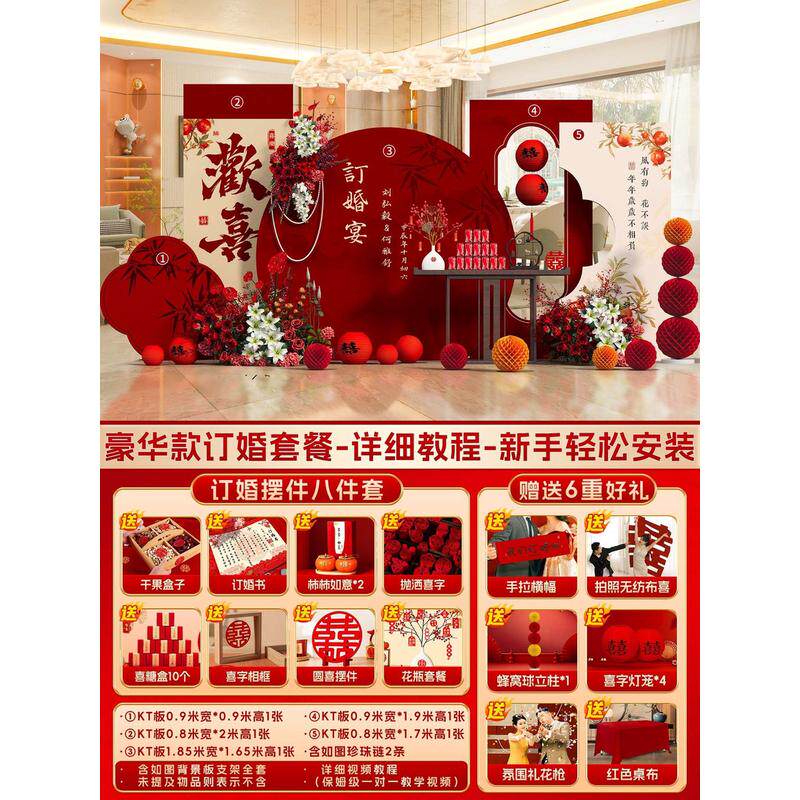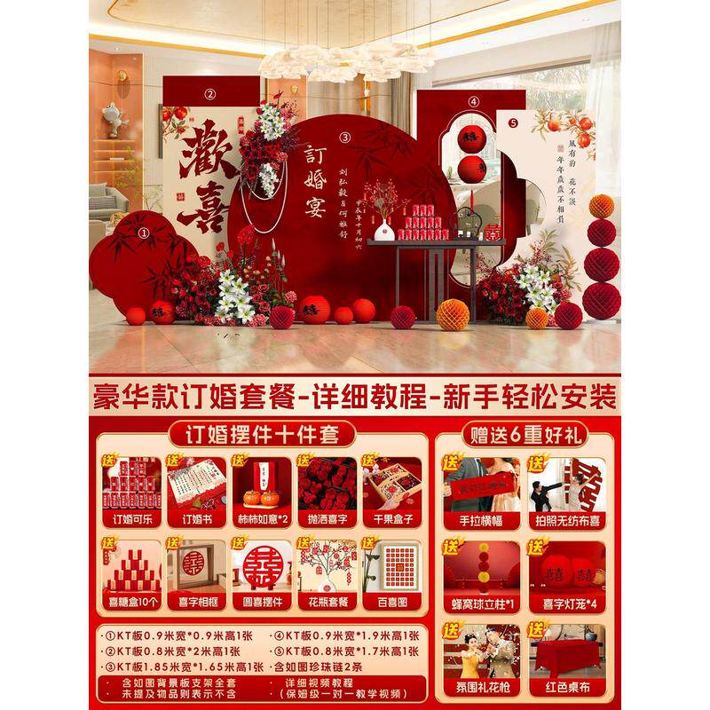 背景墙订婚布置装饰kt板中式2024仪式感全套摆件摆台拍照用品道具
