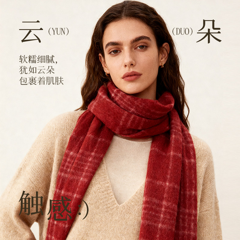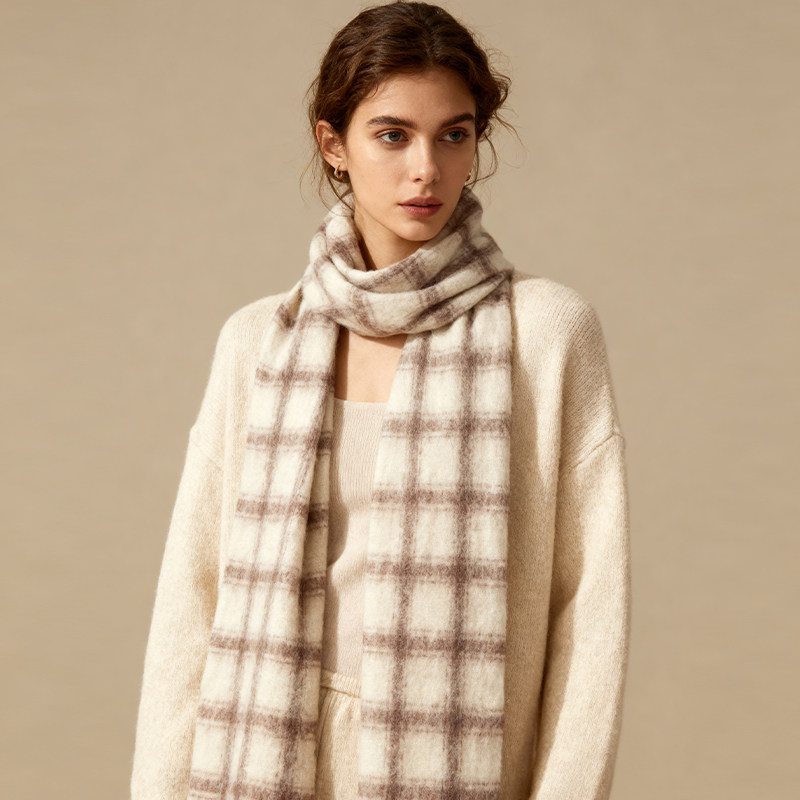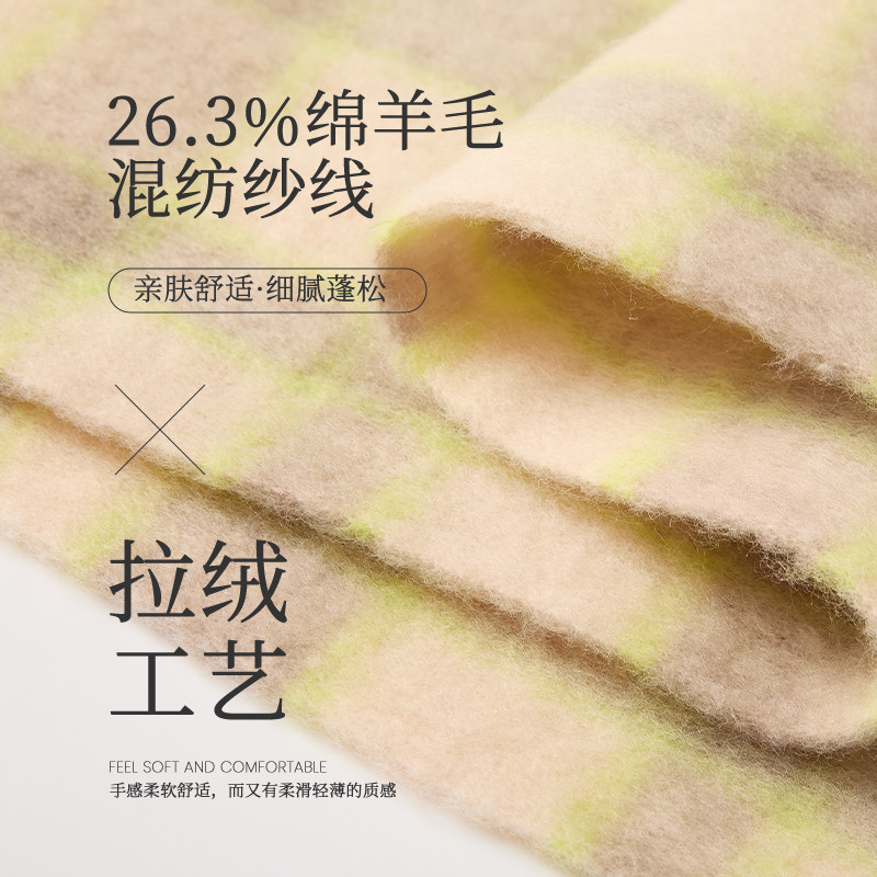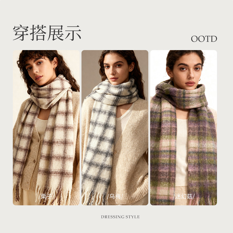 JESSIEJANE羊毛混纺格纹流苏围巾女冬季2025新款韩版时尚百搭长款