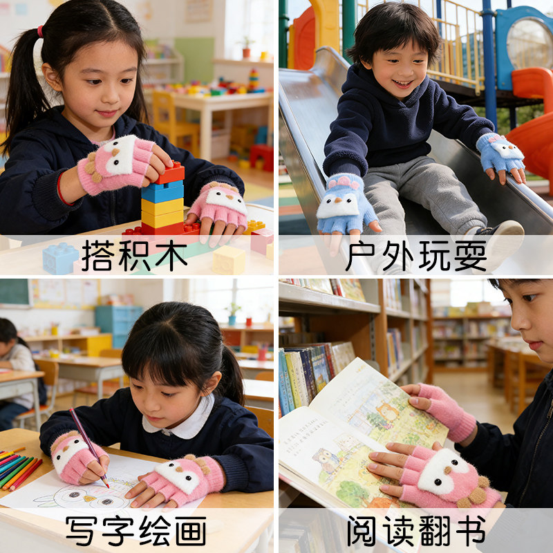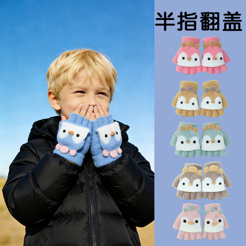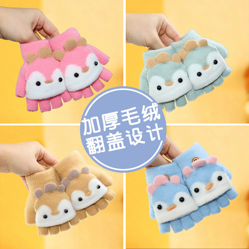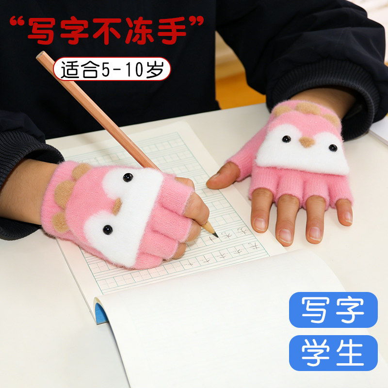 秋冬季保暖手套卡通可爱学生男女孩毛线半指针织翻盖分指防寒手套