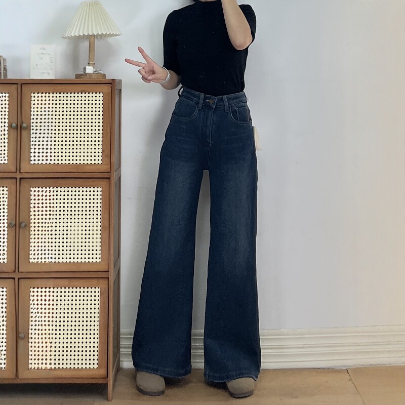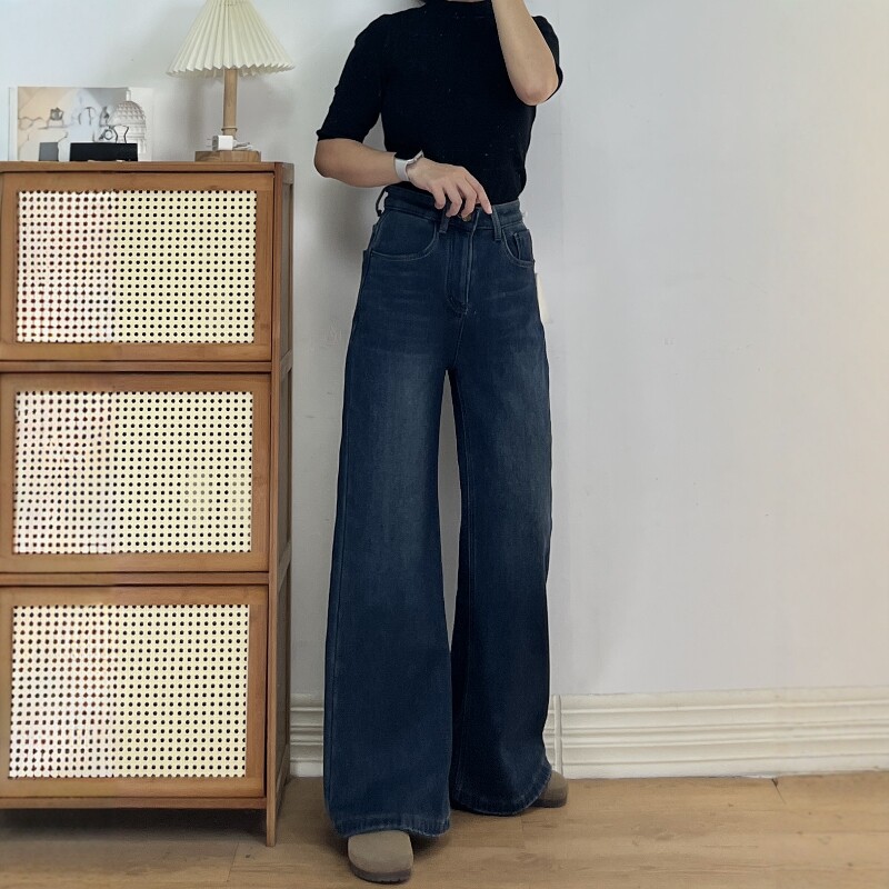 王家有鱼加绒小个子复古蓝直筒阔腿裤女2025年秋冬新款百搭牛仔裤