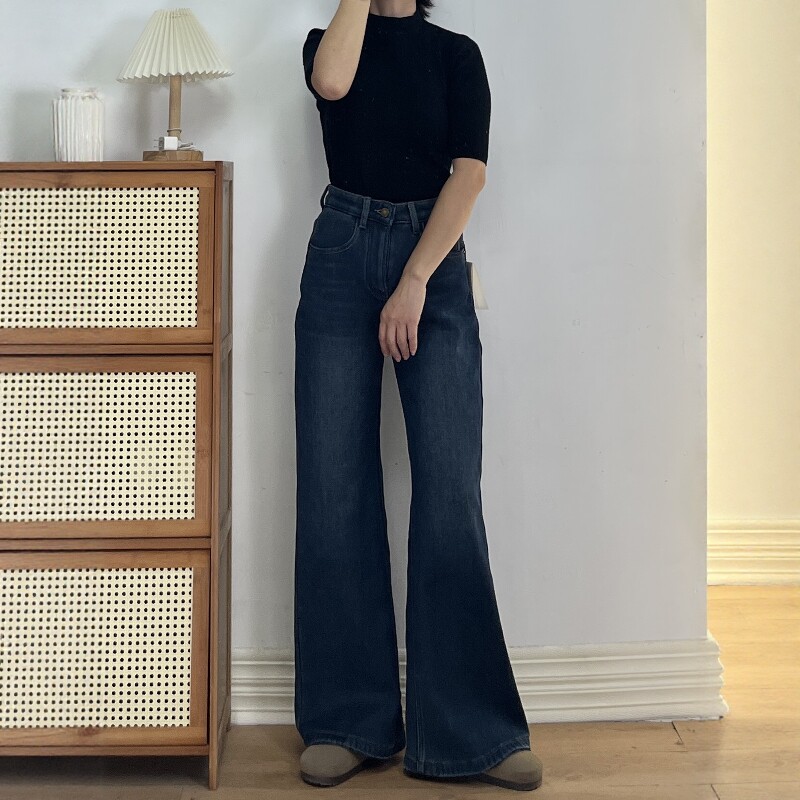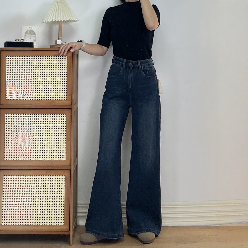 王家有鱼秋季新款2025复古蓝微喇牛仔裤中高腰不贴腿显瘦裤子女款