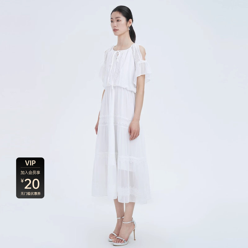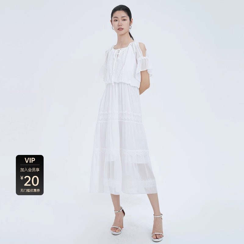sdeer圣迪奥女装圆领露肩蕾丝泡泡袖连衣裙S222Z1278