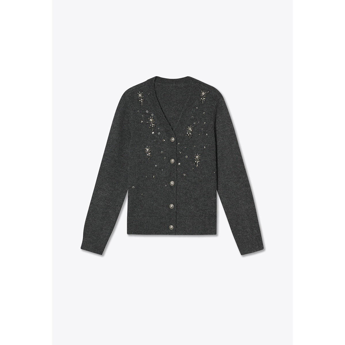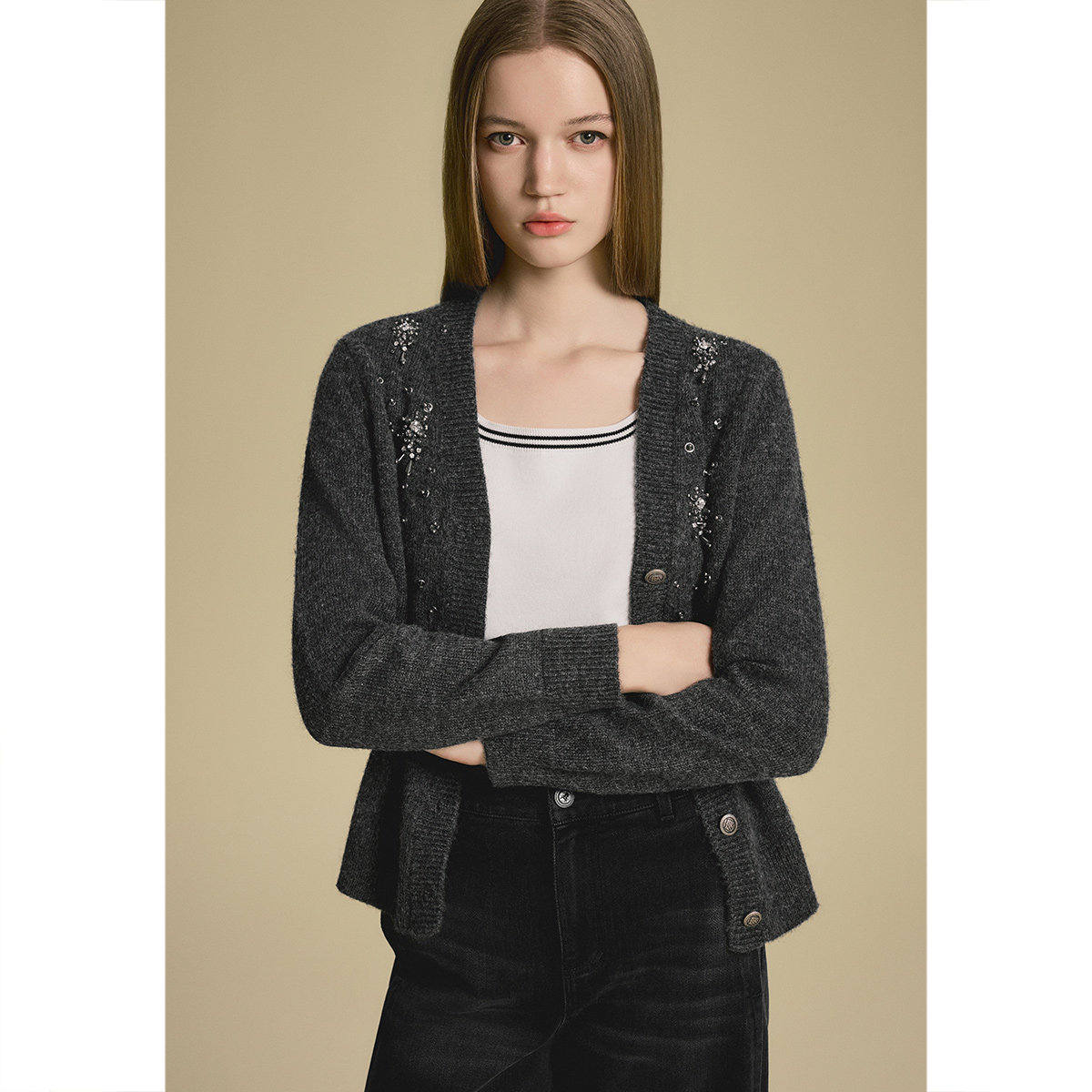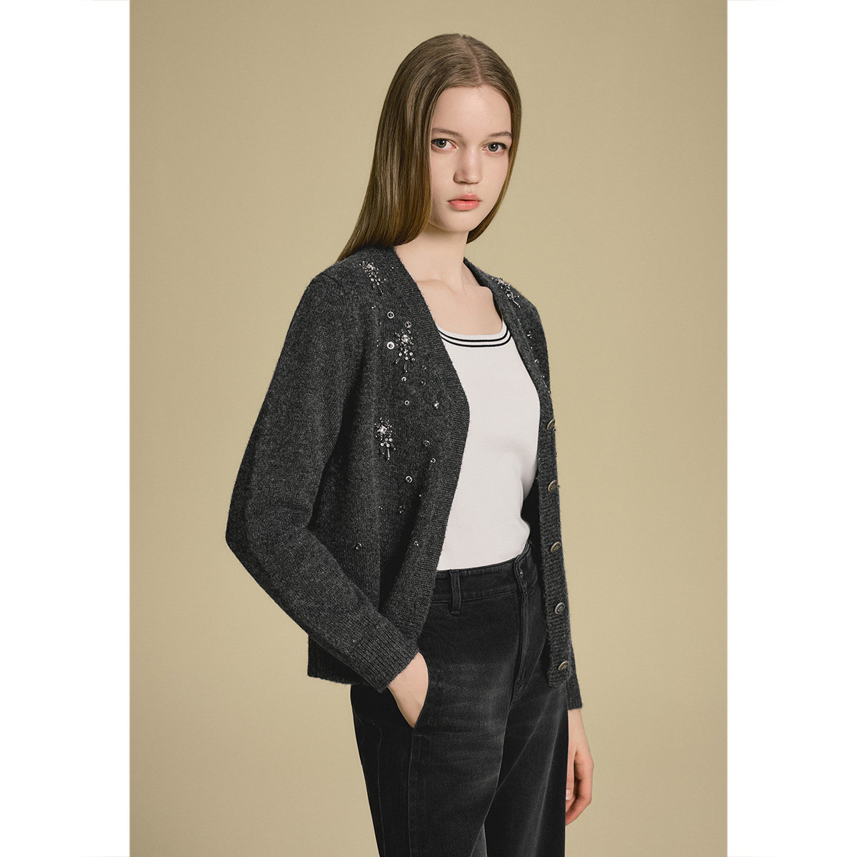诗篇专选羊毛混纺V领钉珠宽松针织开衫外套2025秋款