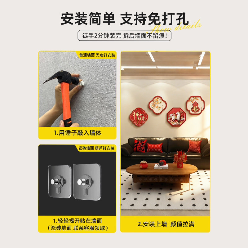 新中式客厅装饰画财神爷福字创意四联壁画恭喜发财沙发背景墙挂画