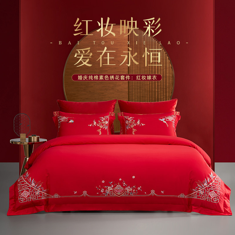 梦洁家纺婚庆60S长绒棉提花绣花结婚套组四件套喜被婚嫁床上用品