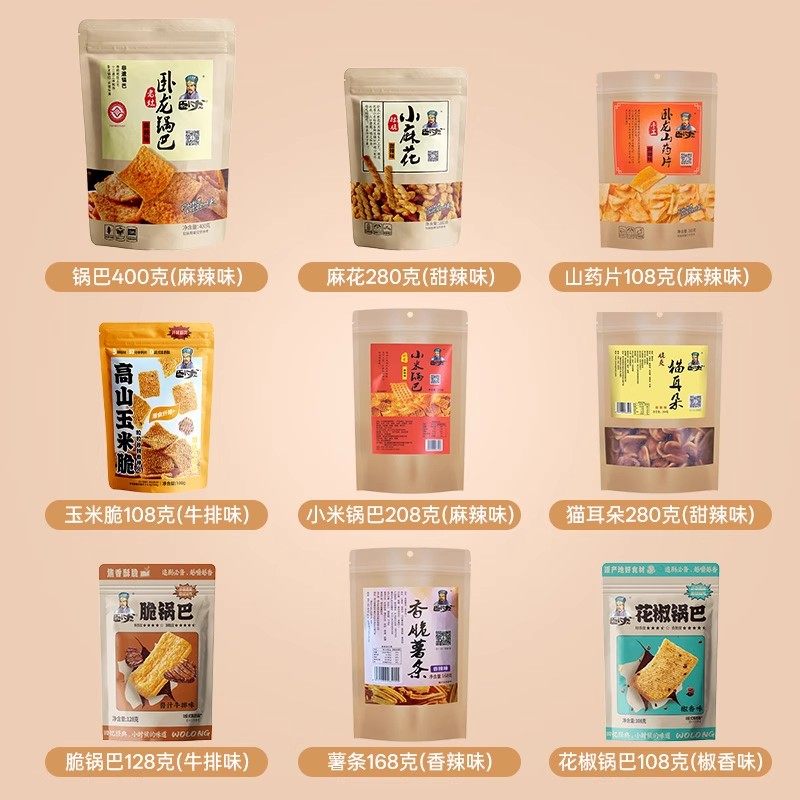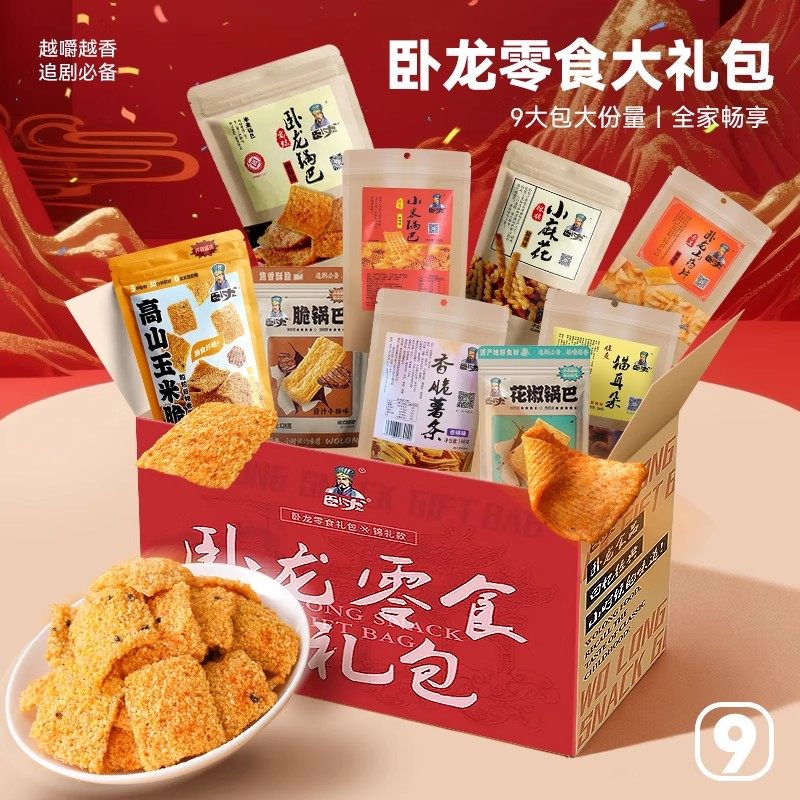 卧龙锅巴年货零食大礼包麻花薯条猫耳朵休闲食品9包过年送礼分享