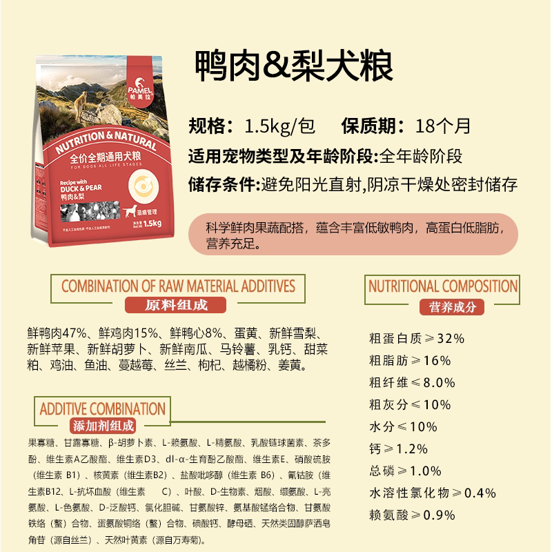 帕美拉无谷鸭肉梨狗粮天然低敏全价幼犬成犬通用宠物鲜肉营养犬粮