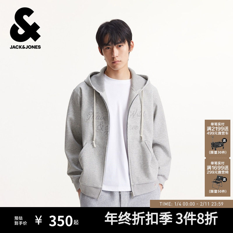杰克琼斯男装秋季卫衣抽绳连帽开衫字母刺绣纯色略宽松款长袖上衣