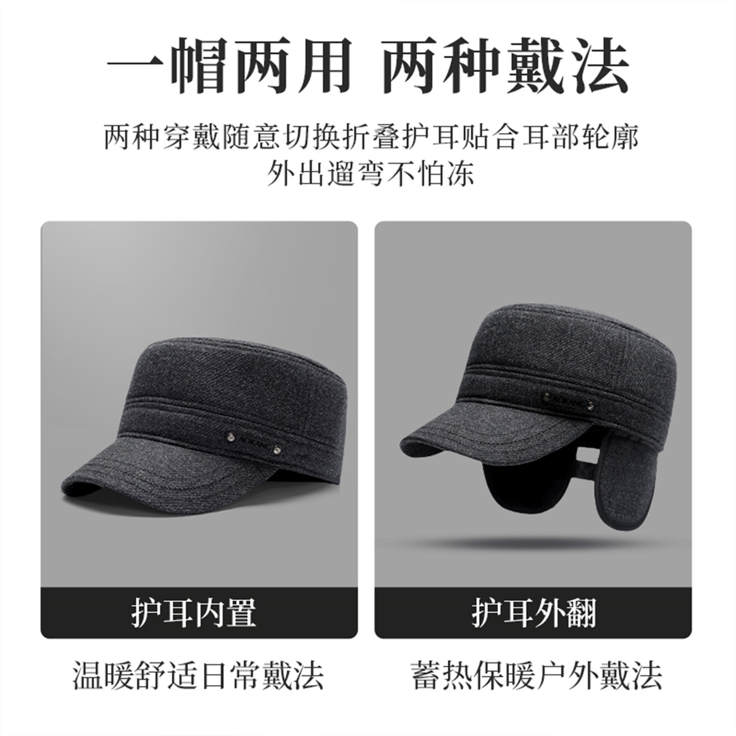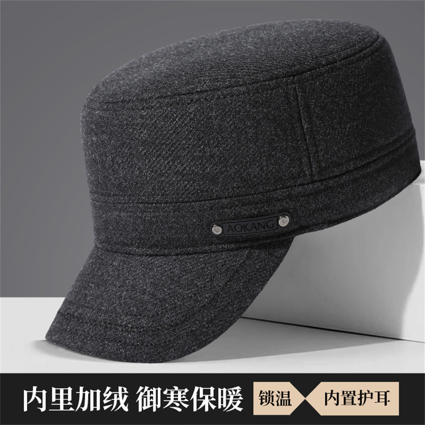 奥康帽子男士秋冬新款加绒保暖平顶帽中老年人爸爸爷爷护耳棉帽J