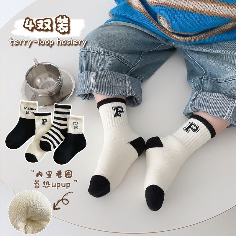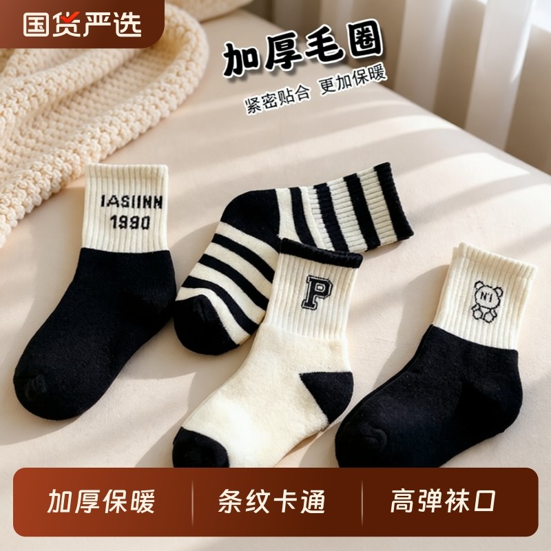 儿童袜子秋冬男童中筒袜加绒加厚毛圈袜男孩女孩毛巾学生袜条纹