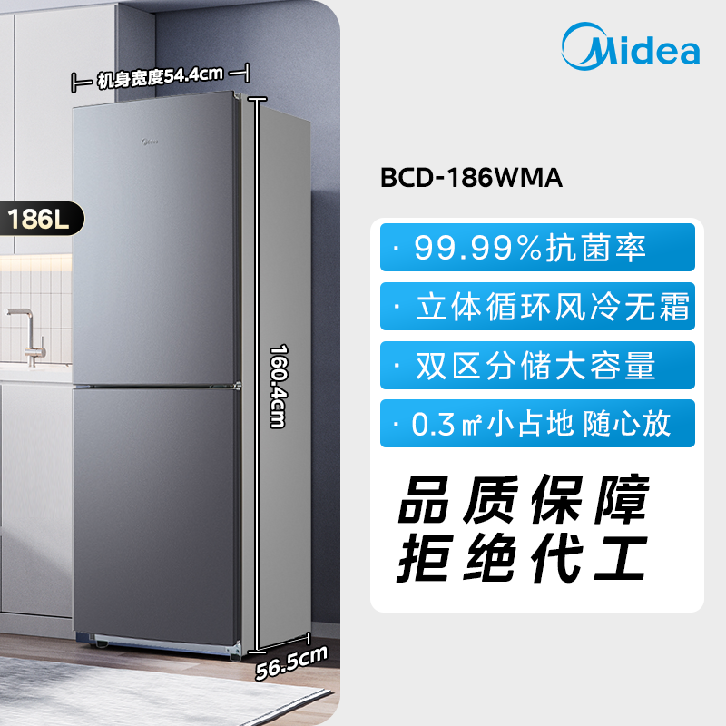 美的180+/195风冷无霜两门家用电冰箱小户型节能低噪冷藏冷冻租房