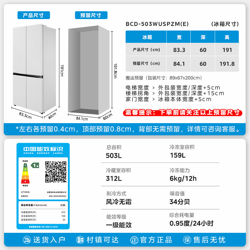 美的503十字双开四门超薄零嵌入式白色冰箱家用风冷无霜一级能效