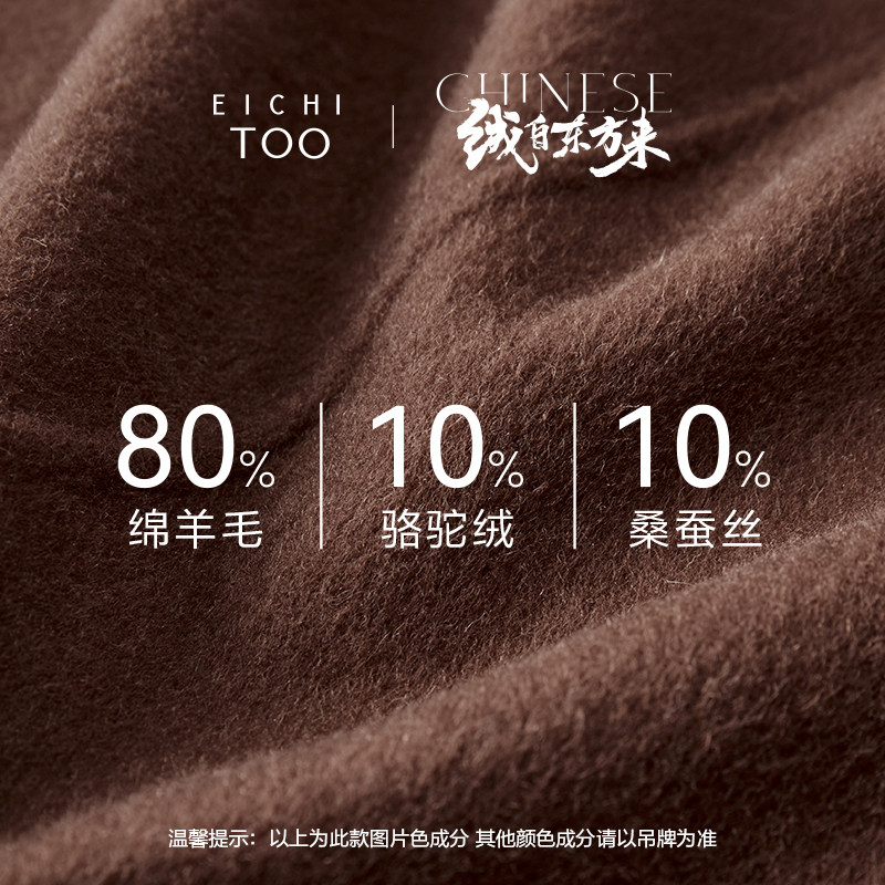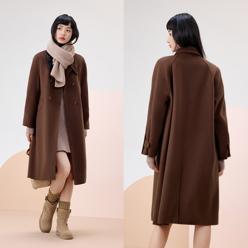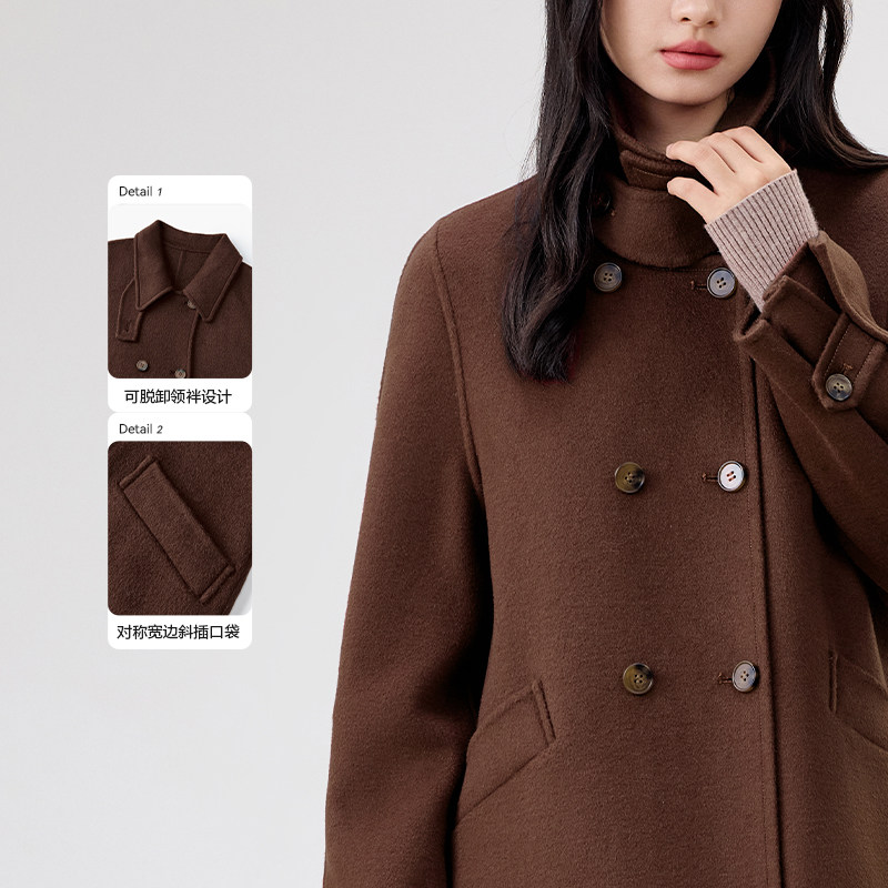 爱居兔蚕丝驼绒双面呢大衣冬季新简约大气双排扣可拆卸针织领大衣