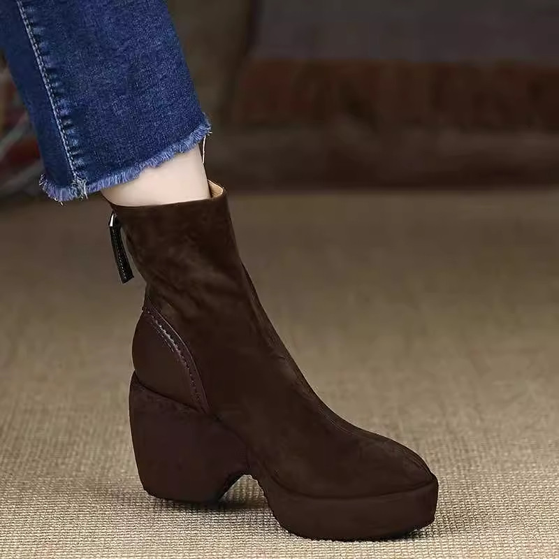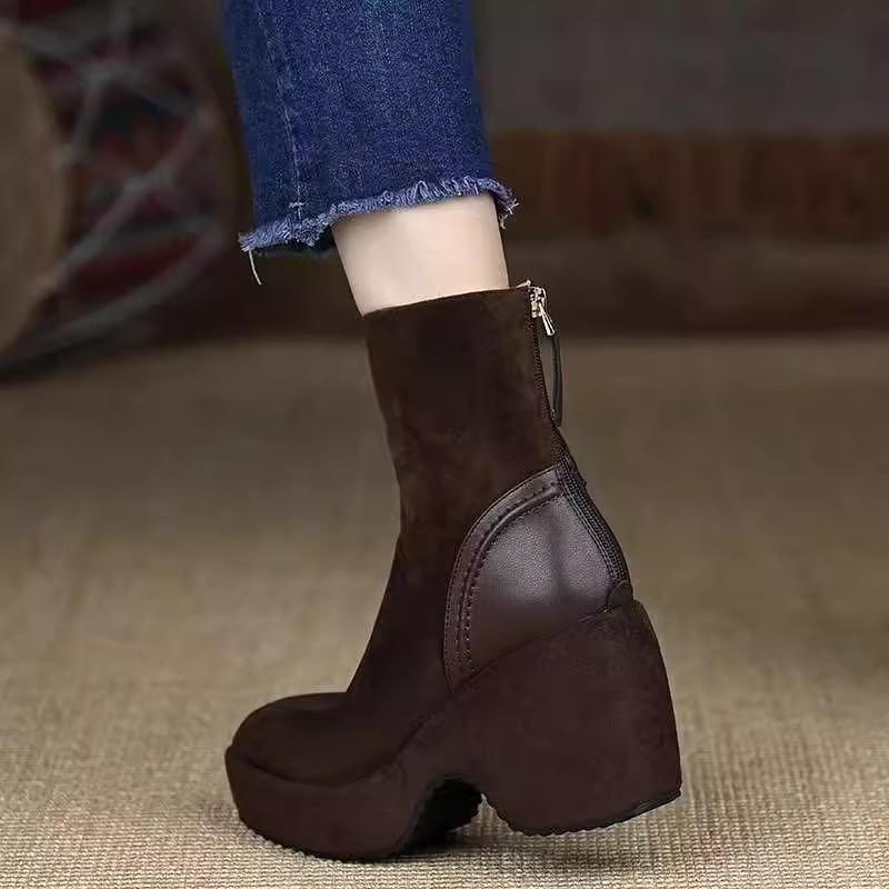 棕色靴子!小个子内增高7CM法式方头靴2025冬新款绒面粗跟短靴女