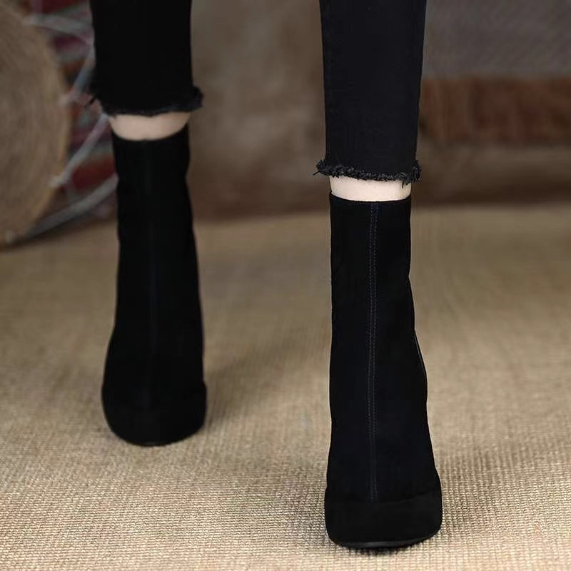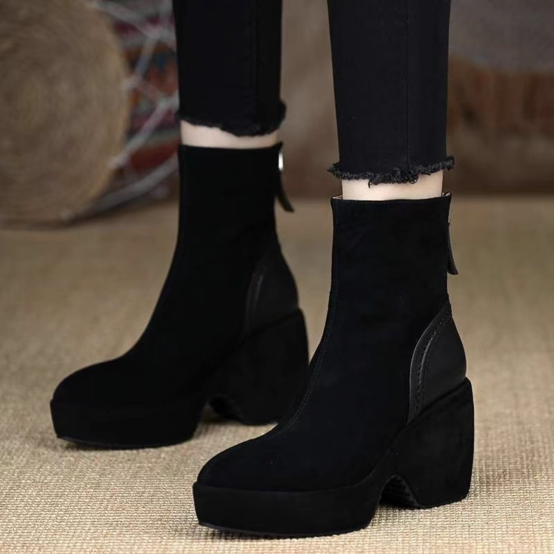 穿~2025秋冬9CM厚底防水台不累脚高跟短靴真皮女靴牛皮坡跟黑色