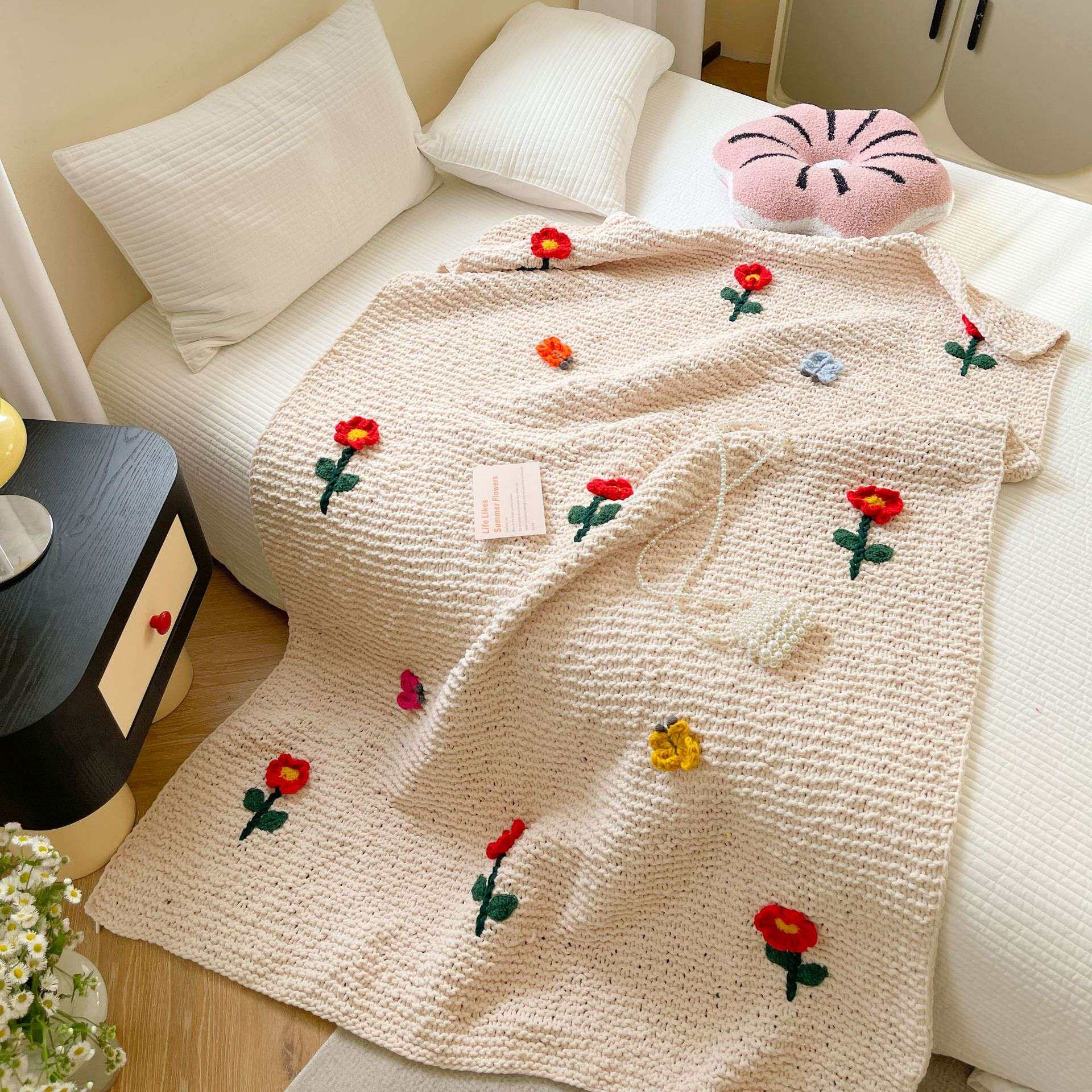 纯手工重工棒针线毯粗毛线毯子民宿风立体花朵盖毯冰条绒毛毯