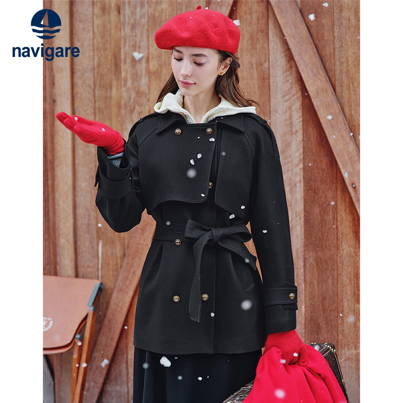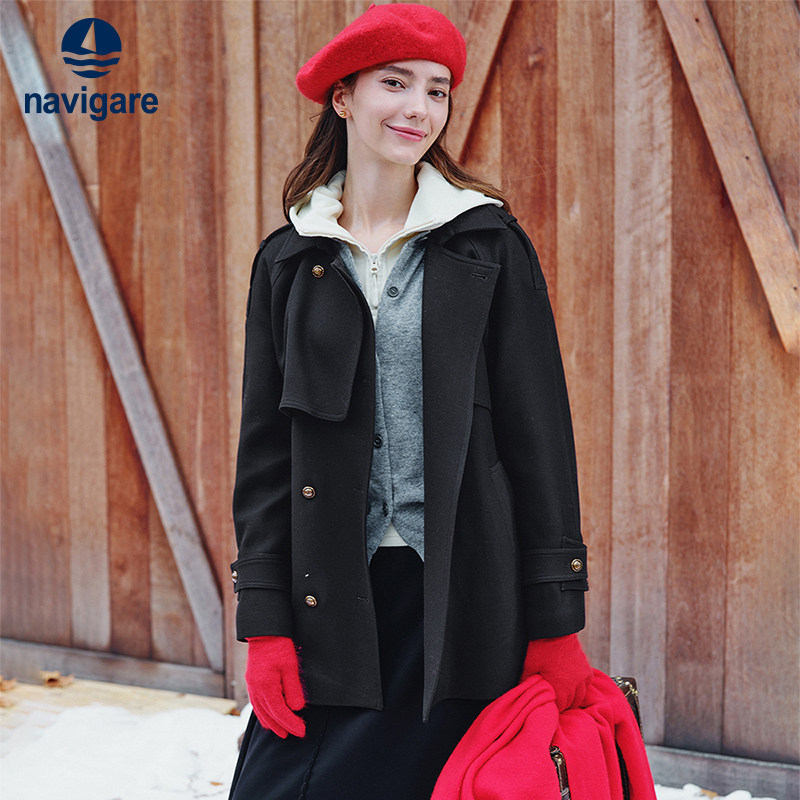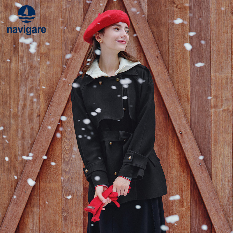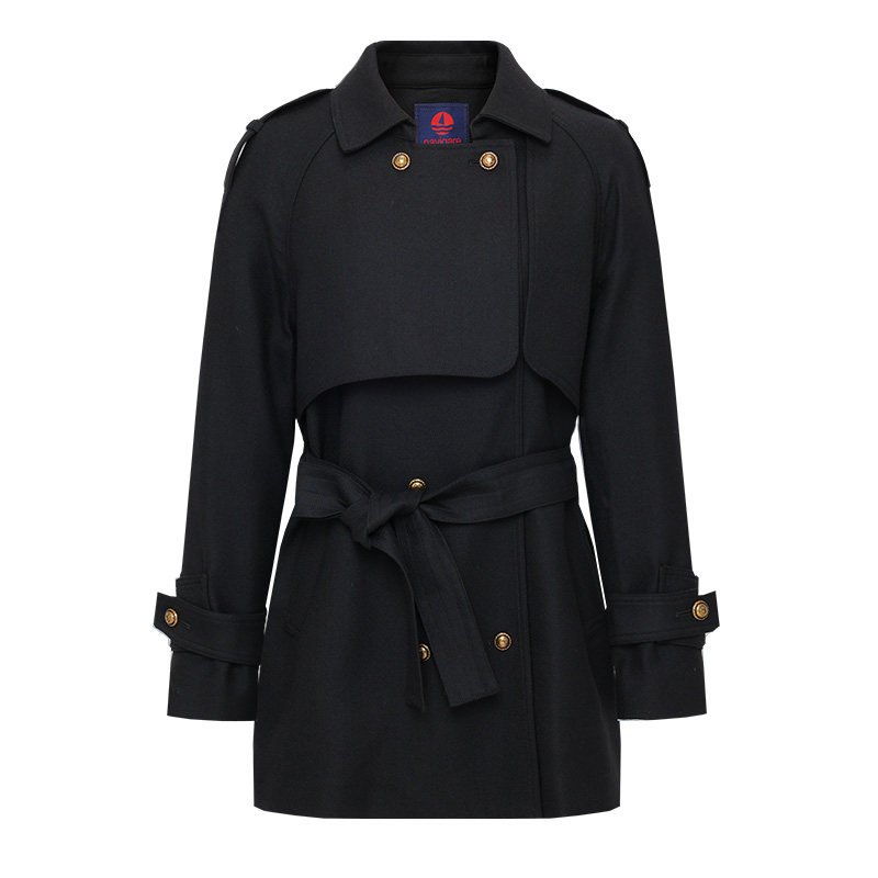 [纯羊毛]Navigare意大利小帆船黑色时尚风衣女秋季中长款外套