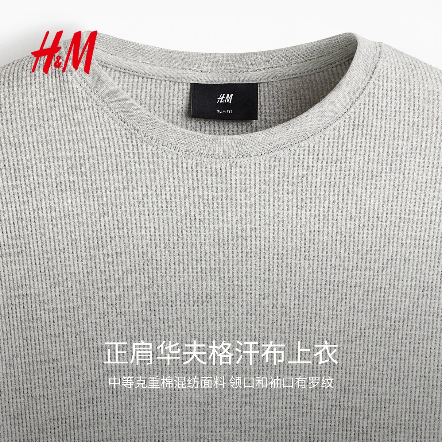 HM男装女装T恤冬季圆领休闲时尚正肩华夫格套头长打底衫0795243