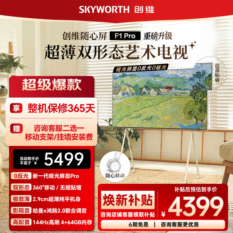 创维随心屏F1 Pro 55英寸4k壁纸超薄无缝贴墙可移动艺术电视壁画