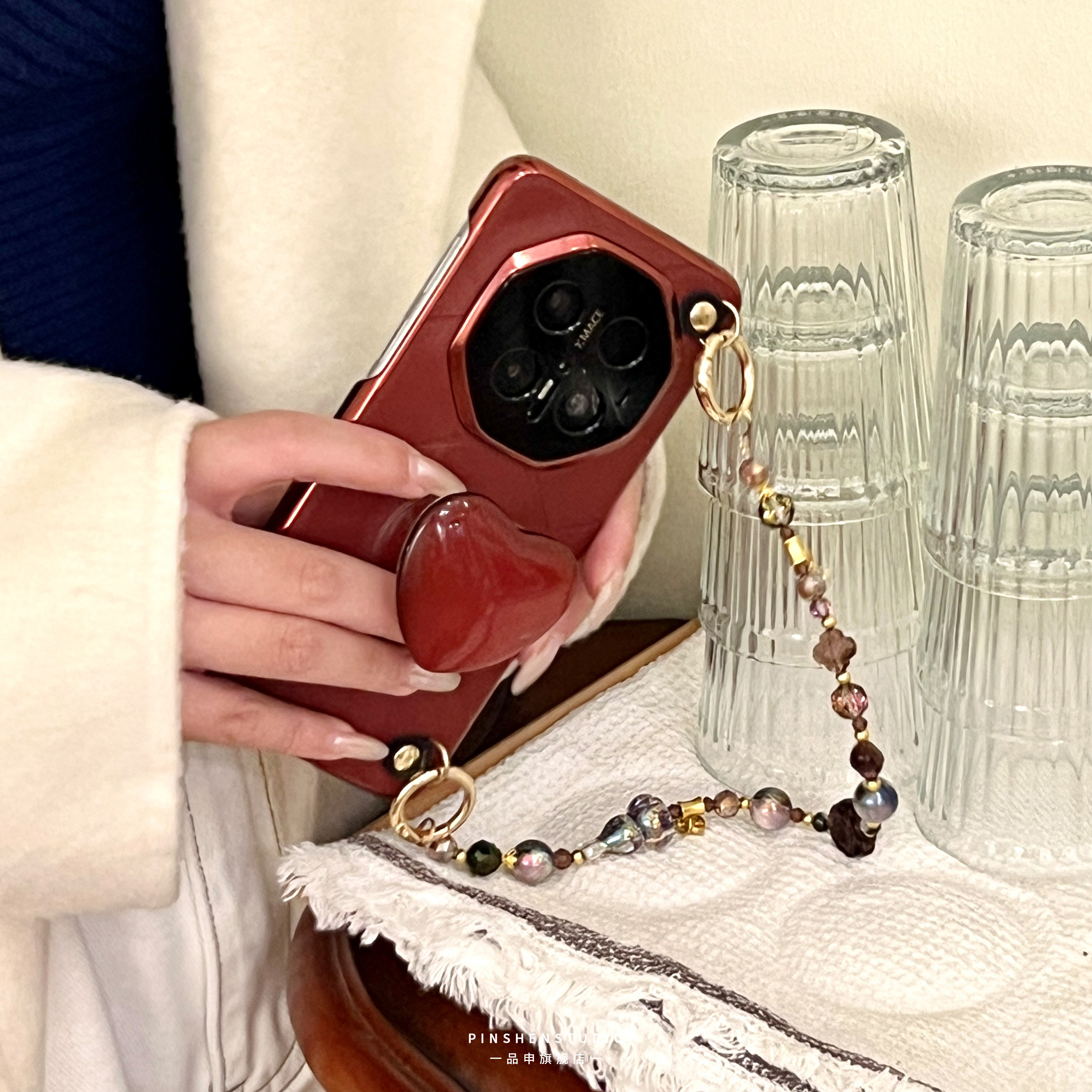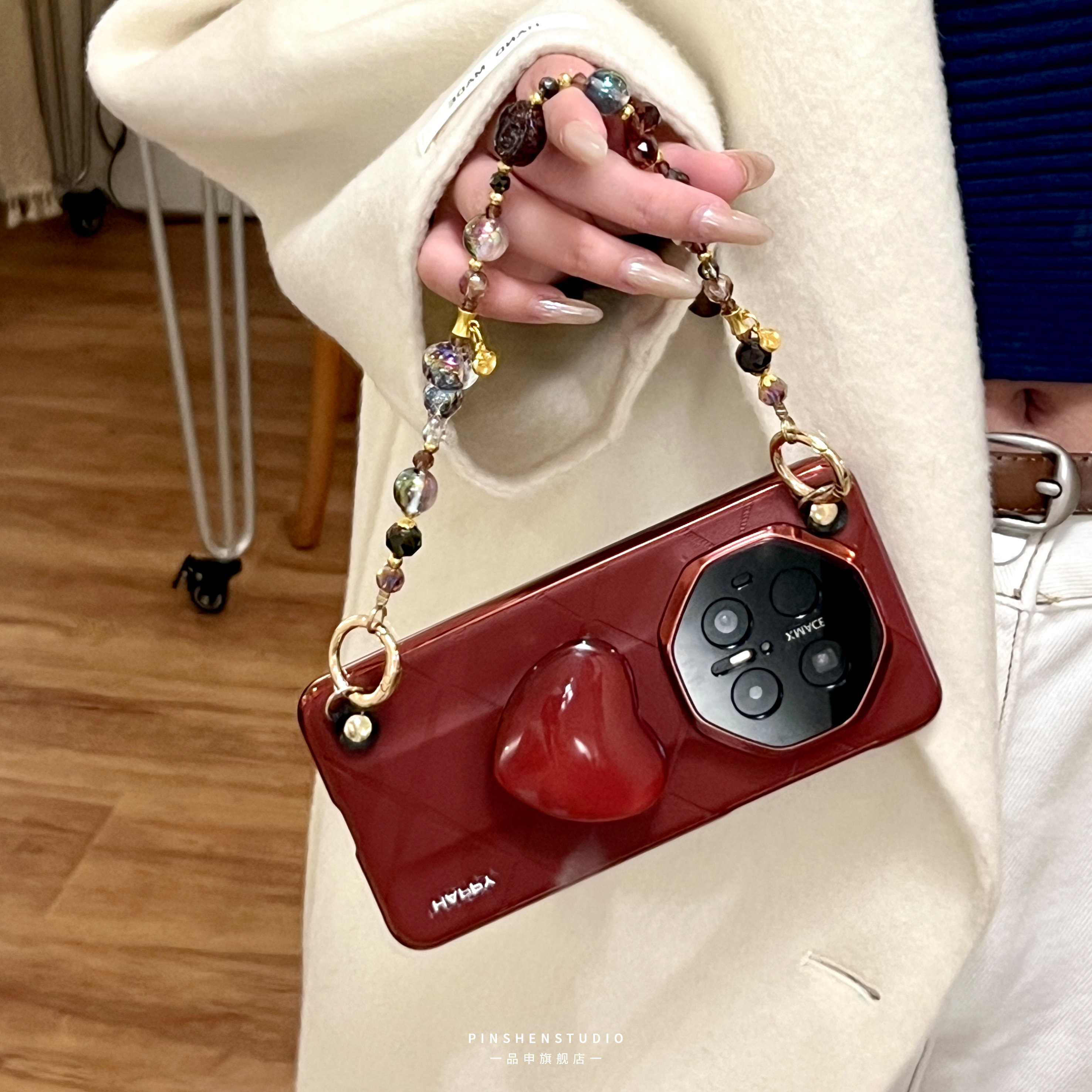 品申原创香颂酒红立体爱心支架手提链条适用华为mate80pro手机壳全包防摔个性ins风新款iphone17promax保护套