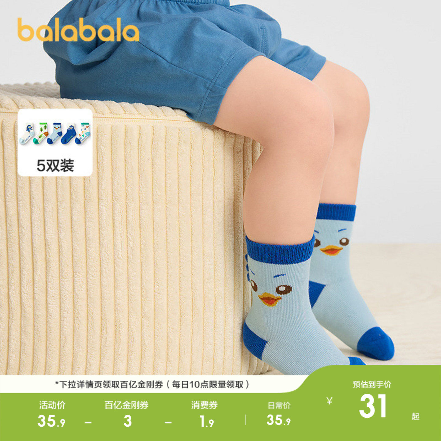 巴拉巴拉儿童袜子宝宝春秋新品婴幼儿中筒袜柔弹无骨手工缝五双装