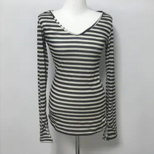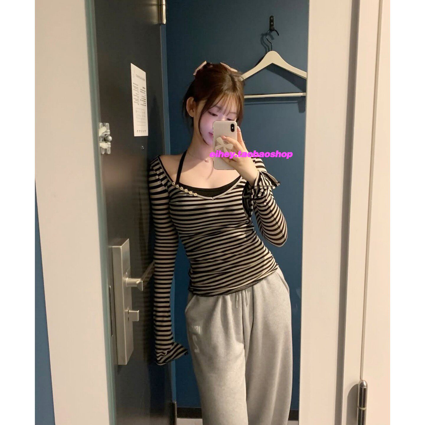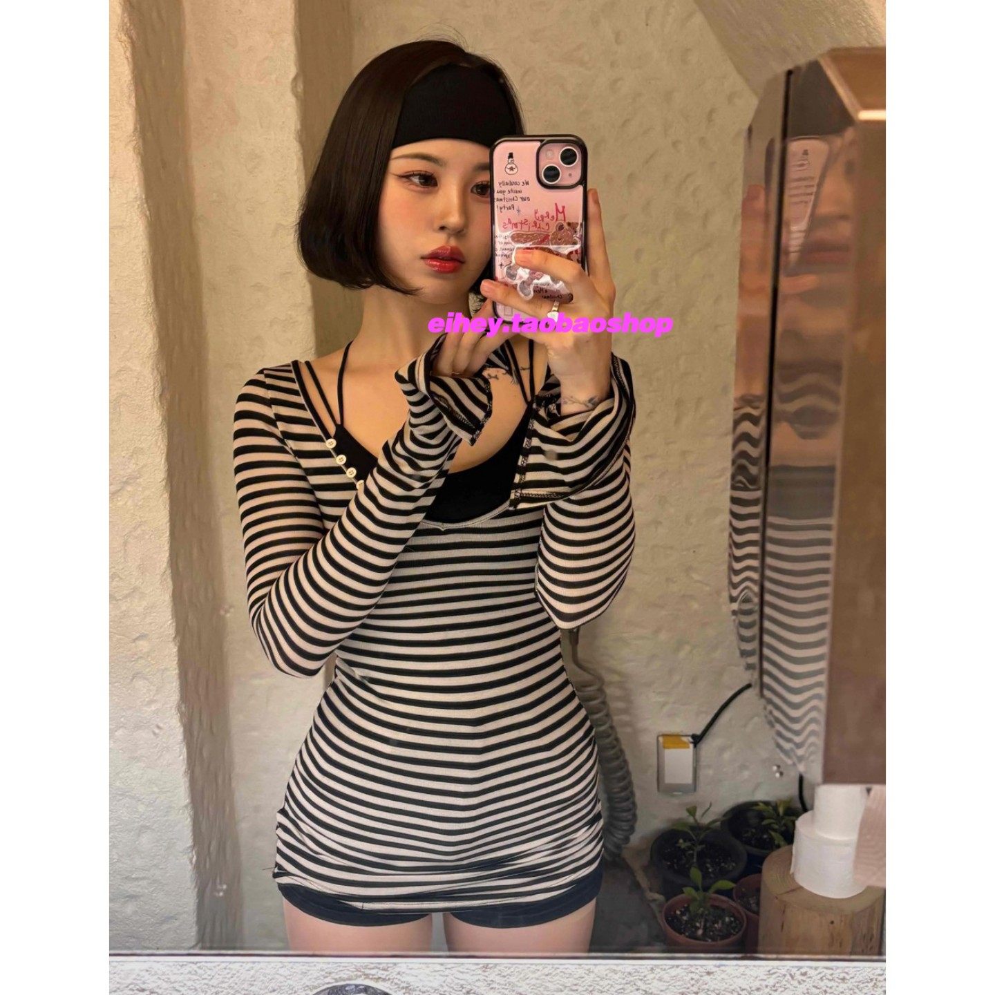 eihey诶嘿修身条纹韩系V领长袖纯欲上衣设计感气质小个子打底衫女