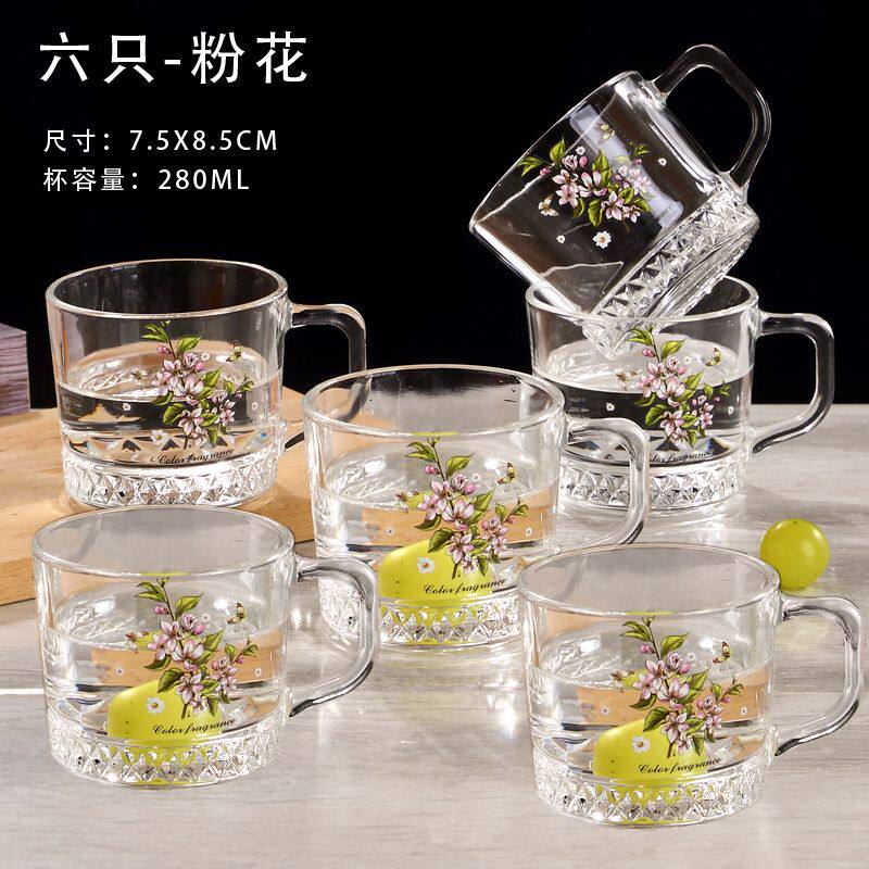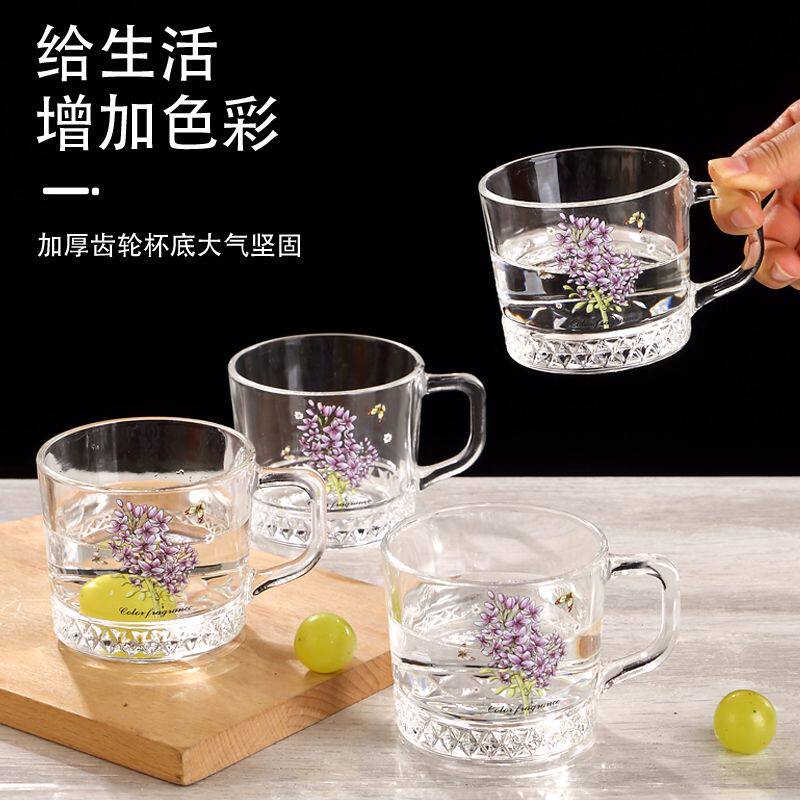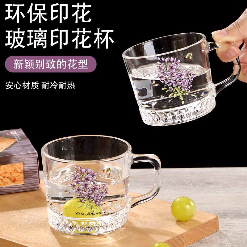 加厚玻璃杯玻璃茶杯早餐杯子家用带把大容量印花水杯牛奶喝水