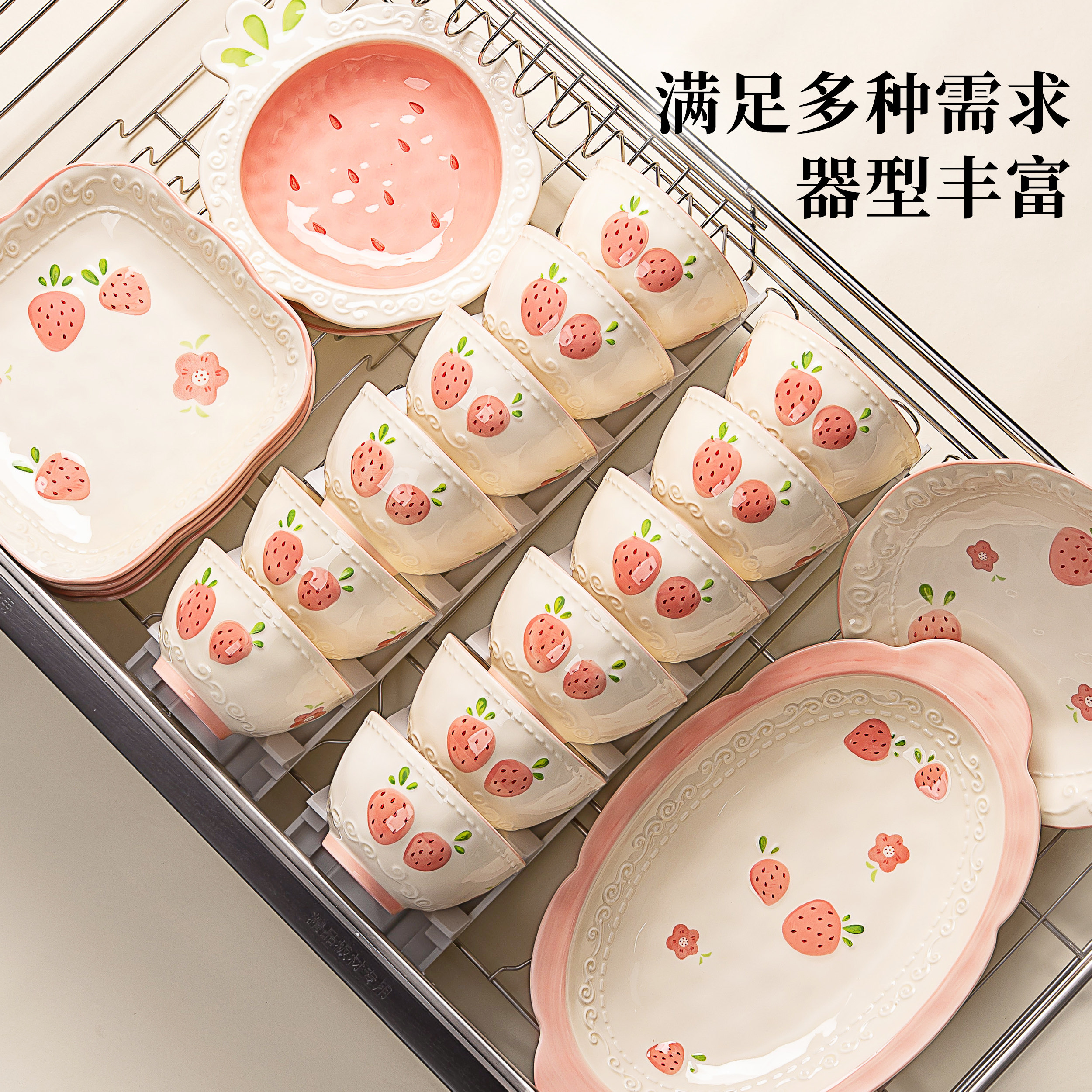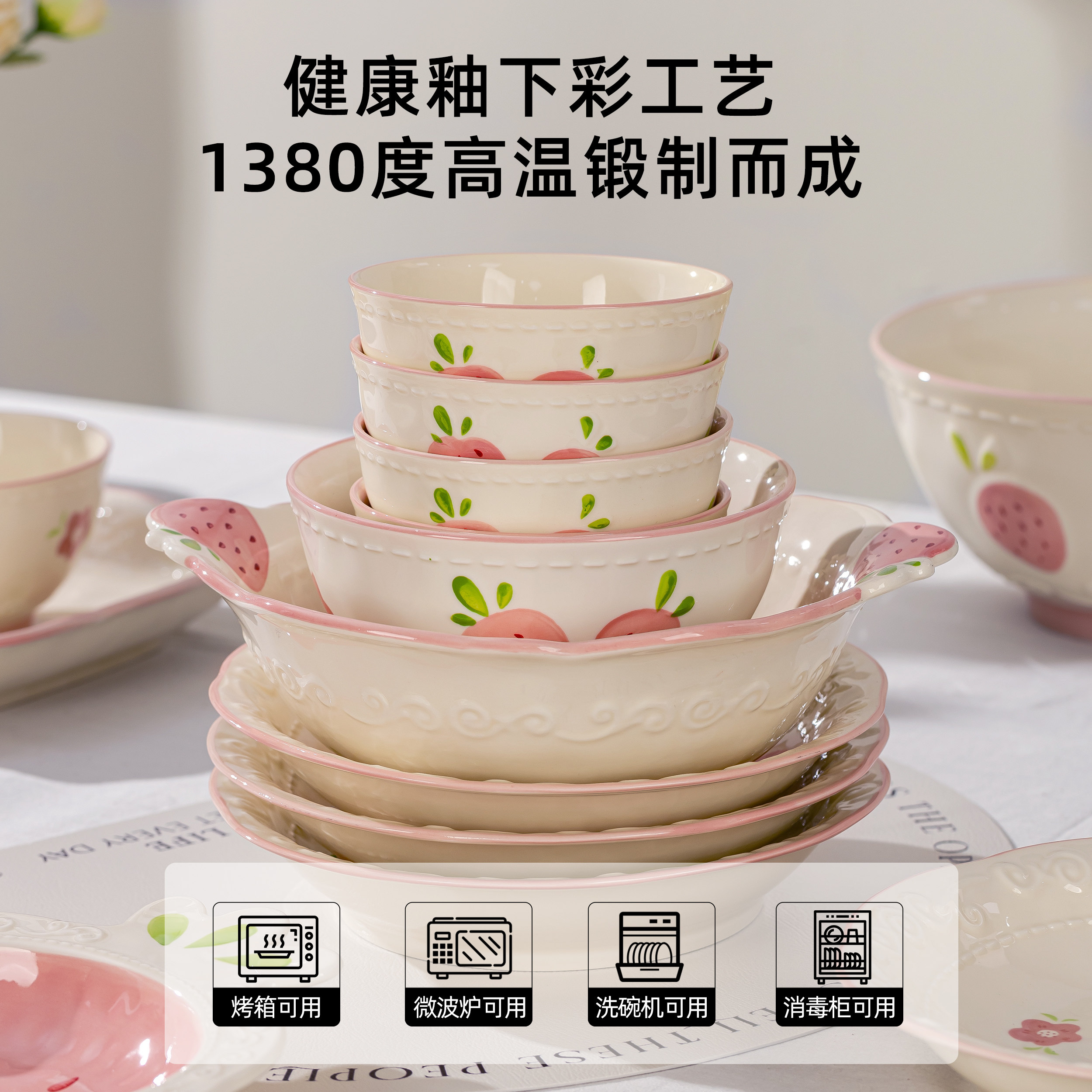 奶油风陶瓷碗家用卡通菜盘子可爱米饭碗汤碗釉下彩儿童餐具耐高温