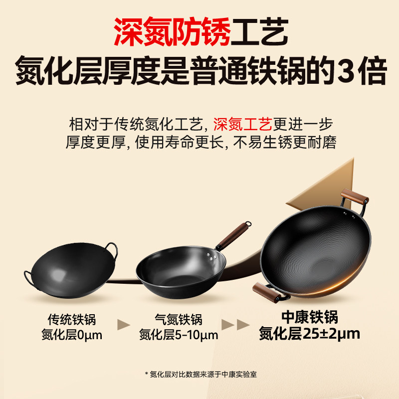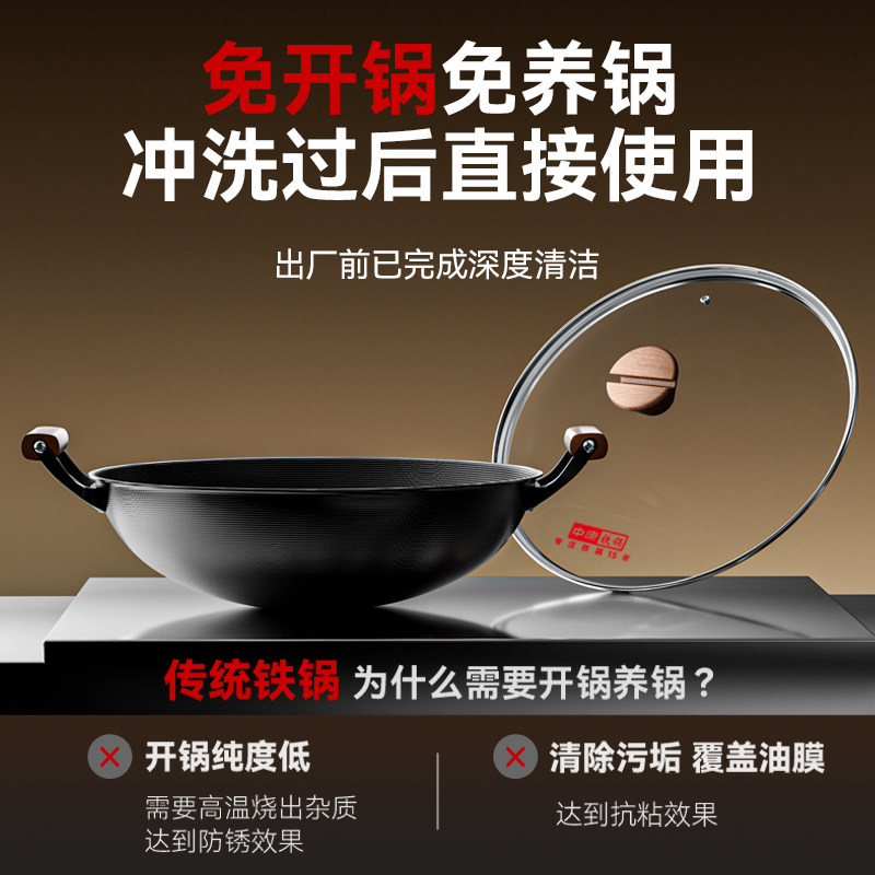 中康铁锅炒菜锅精铁无涂层老式双耳圆底炒锅防锈大炖锅燃气灶适用