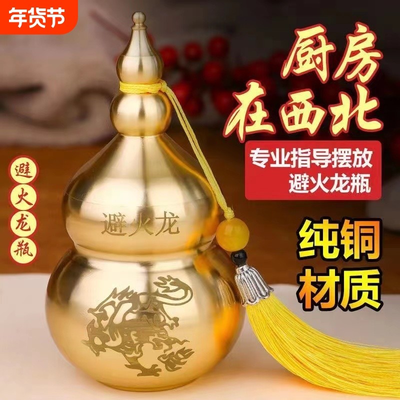 黄铜葫芦厨房辟火龙瓶摆件西北角三避客厅朱砂纯铜黄水晶桌面元宝