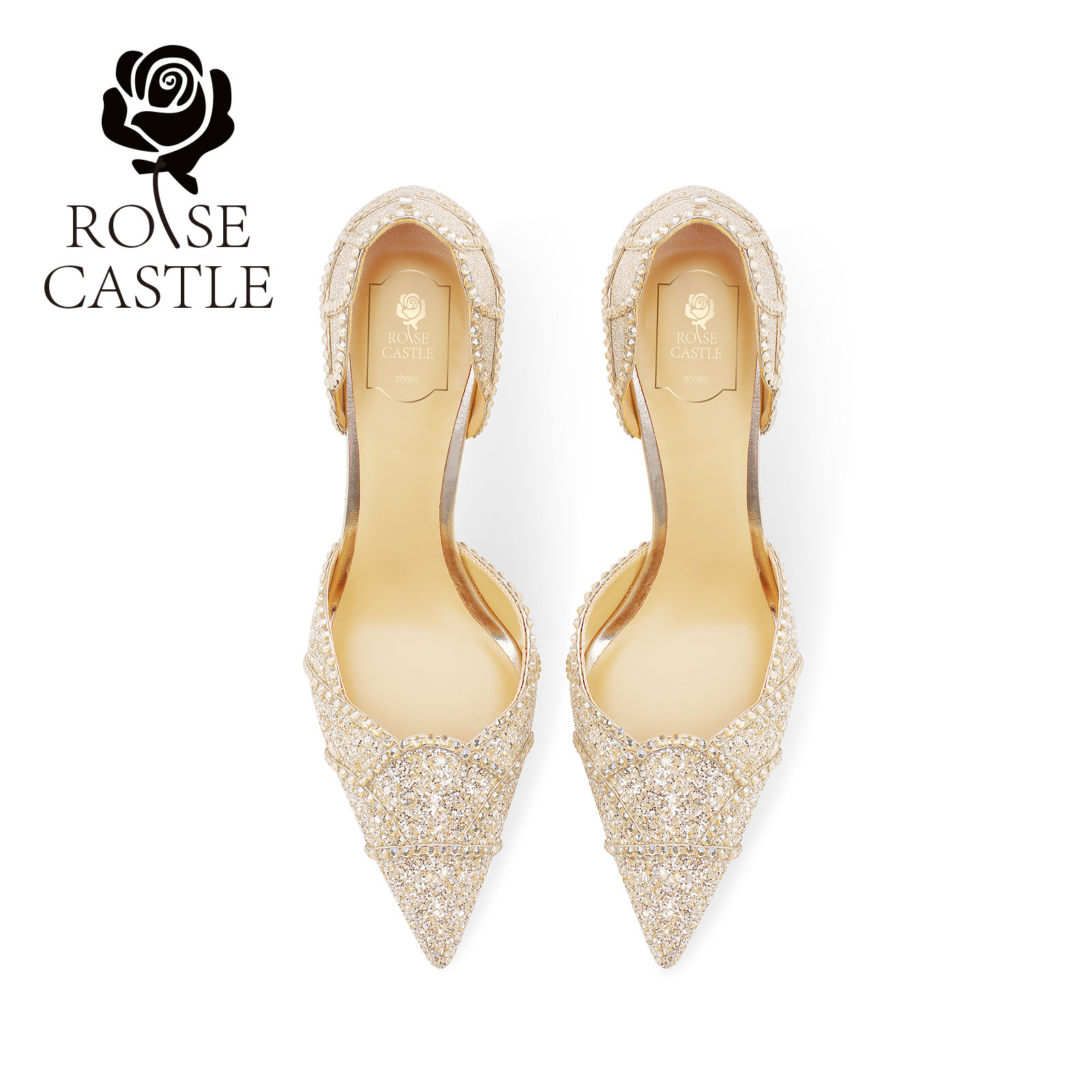 璀璨蔷薇rosecastle金色婚鞋女敬酒鞋旗袍鞋新娘鞋花瓣水晶高跟鞋