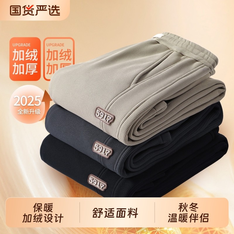 加绒裤子男款春秋款华夫格加厚束脚男2025新款运动卫裤冬季黑色