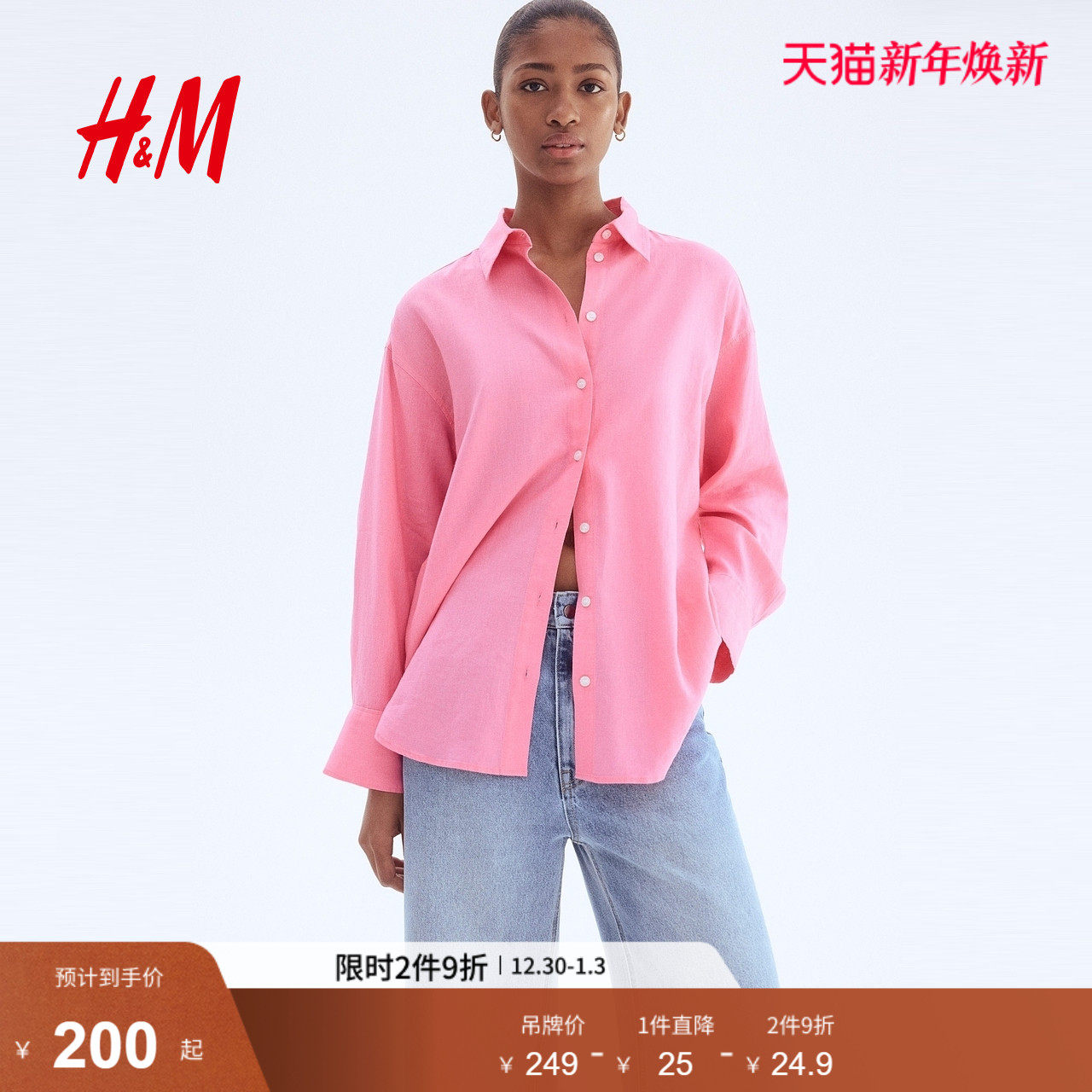 HM女装衬衫2025年冬季新款气质通勤亚麻混纺宽松长袖衬衣1283782