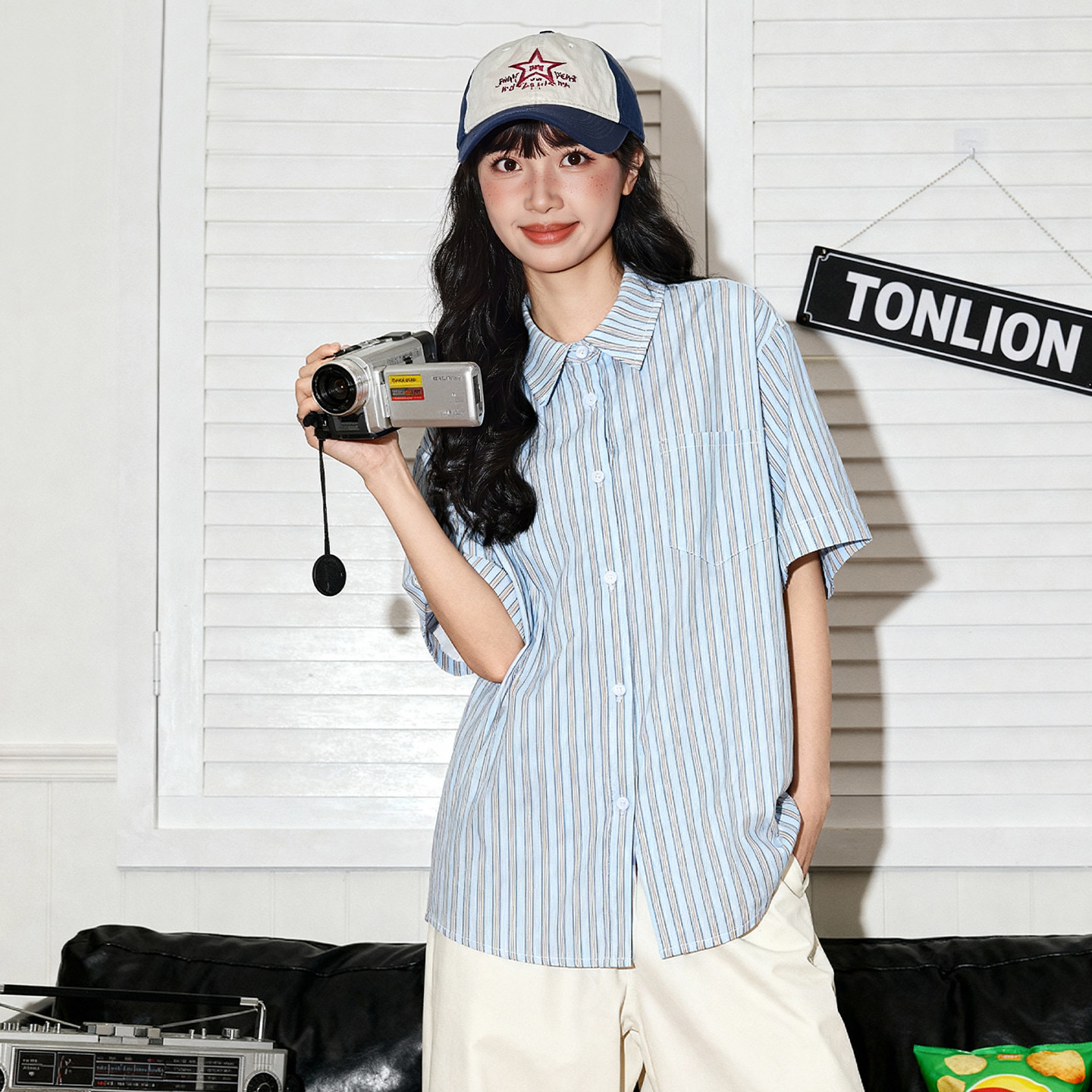 唐狮官方条纹短袖t恤衬衫女2026新款春夏翻领衬衣半袖美式上衣VC