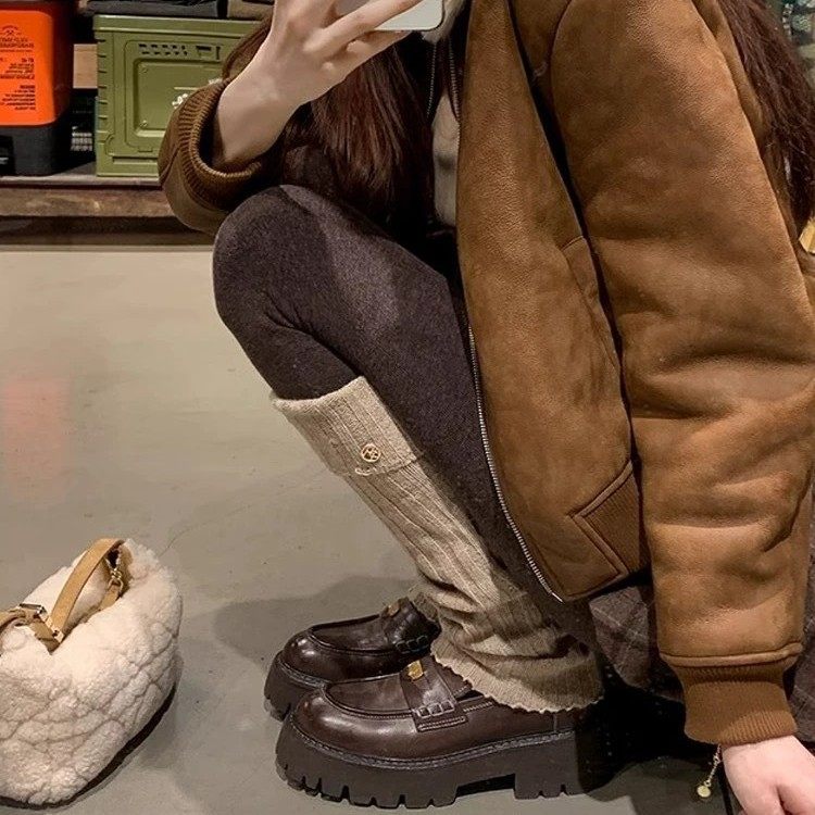 羊皮~棕色山茶花乐福鞋女2025新款通勤粗跟单鞋百搭英伦风小皮鞋