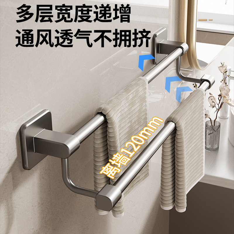 卫生间毛巾架置物架一体浴室免打孔厕所枪灰浴巾架太空铝卫浴双杆