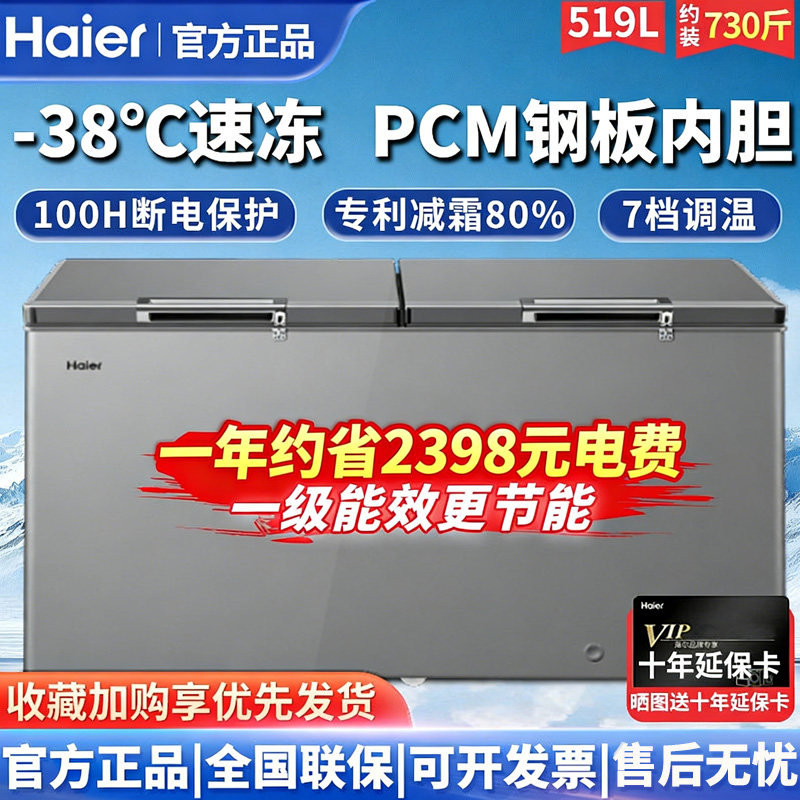 海尔冰柜一级能效300/369/519L家用大容量商用冷柜全冷冻冷藏减霜