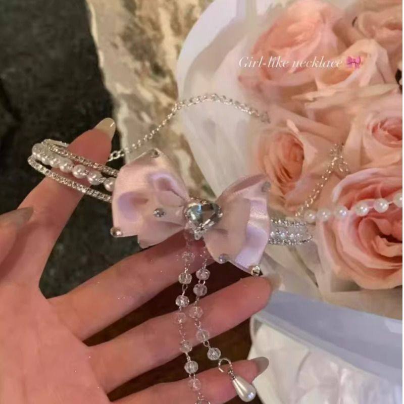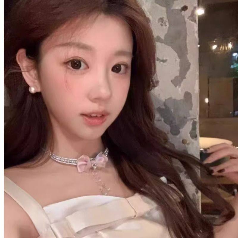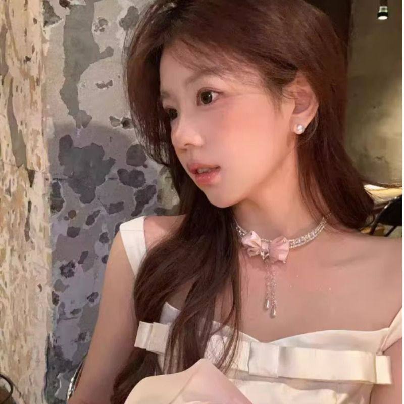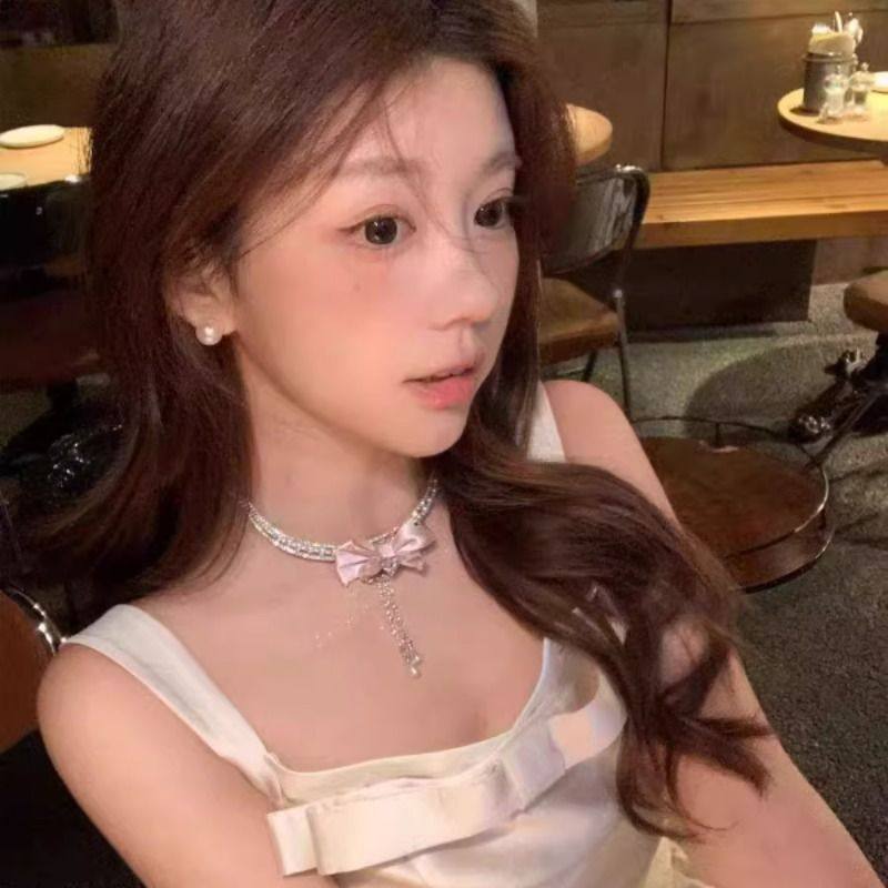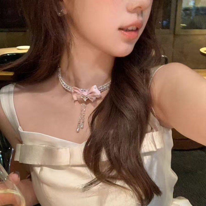 超仙圣诞绝美闪锆爱心蝴蝶结流苏珍珠项链女高级感锁骨颈链choker