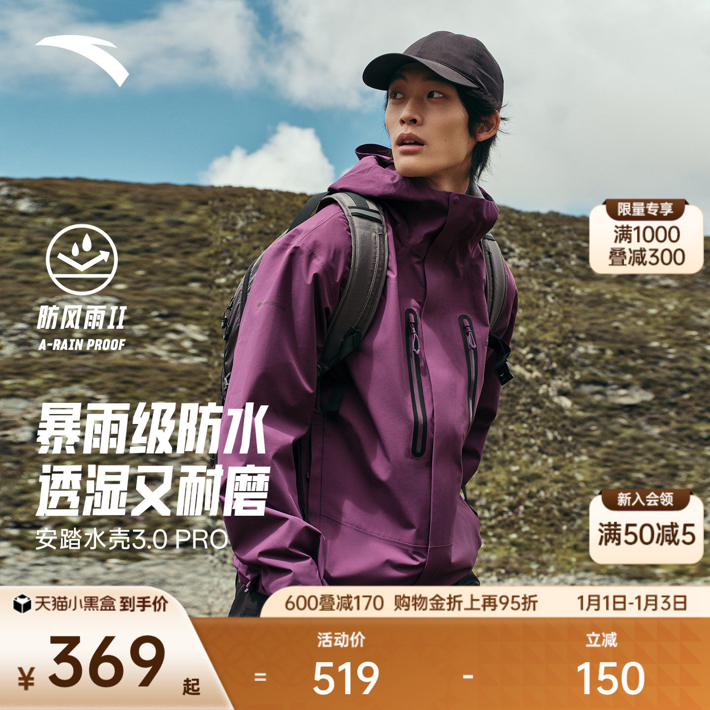 安踏水壳3.0冲锋衣丨大地之壳硬壳防水冲锋衣男户外登山防风外套