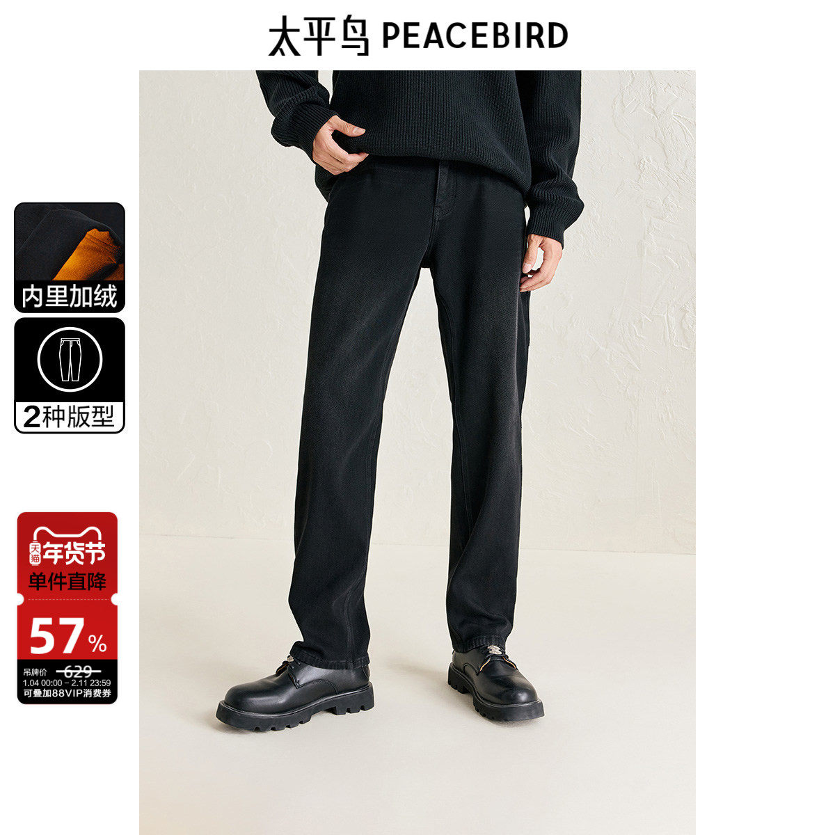 太平鸟男装牛仔裤冬季雪尼尔加绒保暖复绒黑色休闲复古牛仔裤潮