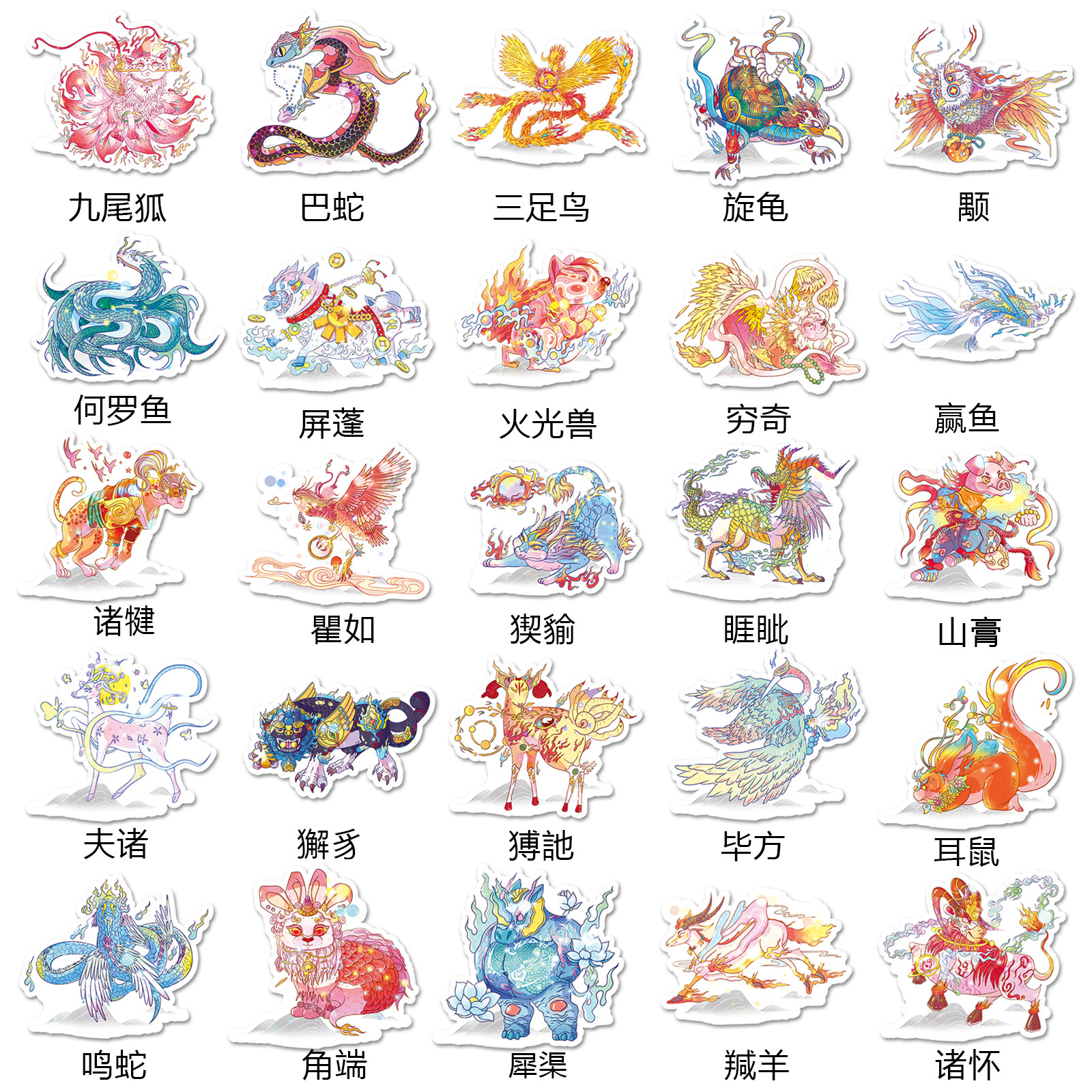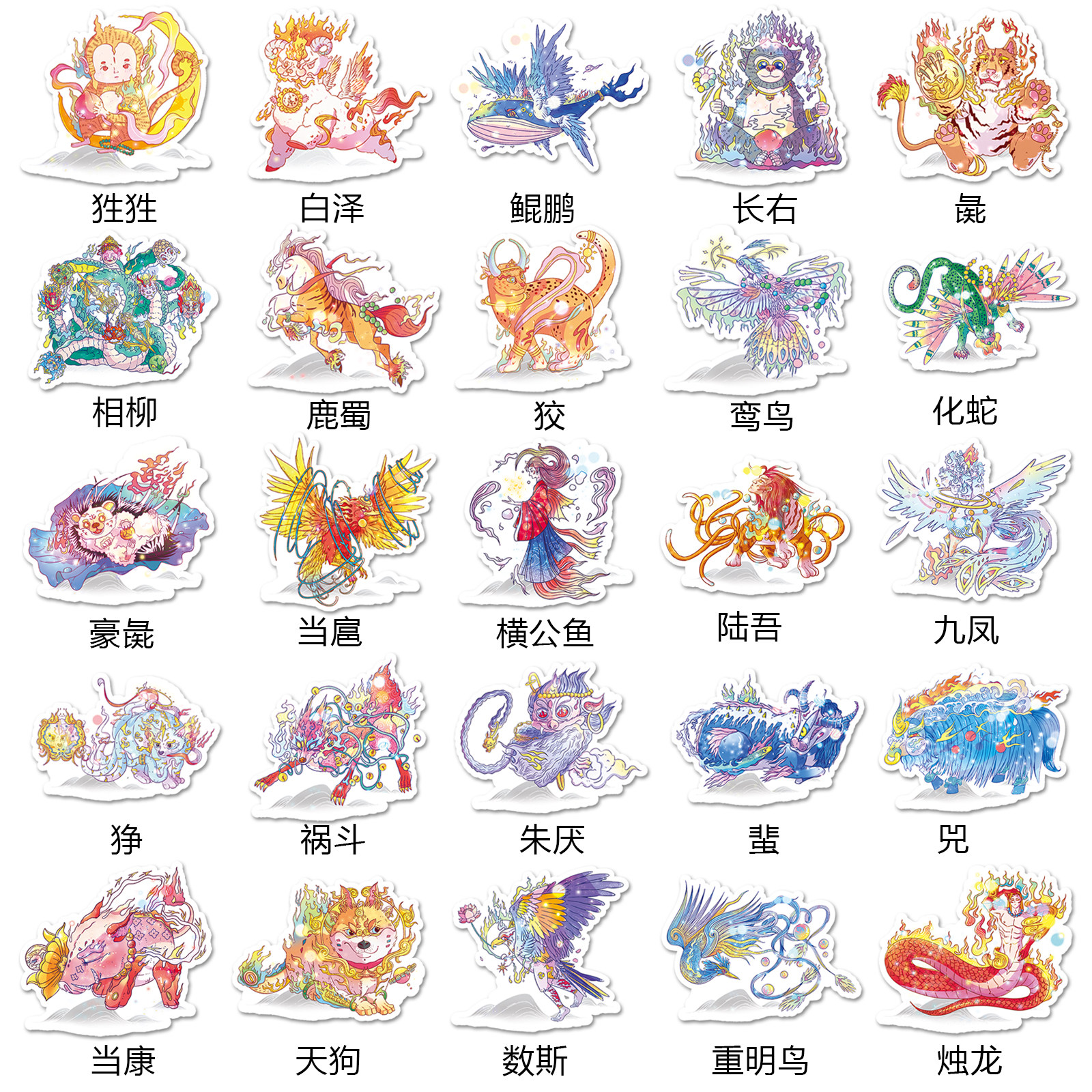 100张国潮山海经异兽插画高颜值中国风彩绘涂鸦DIY防水装饰手机壳平板电脑耳机壳冰箱保温杯滑板车行李箱贴纸