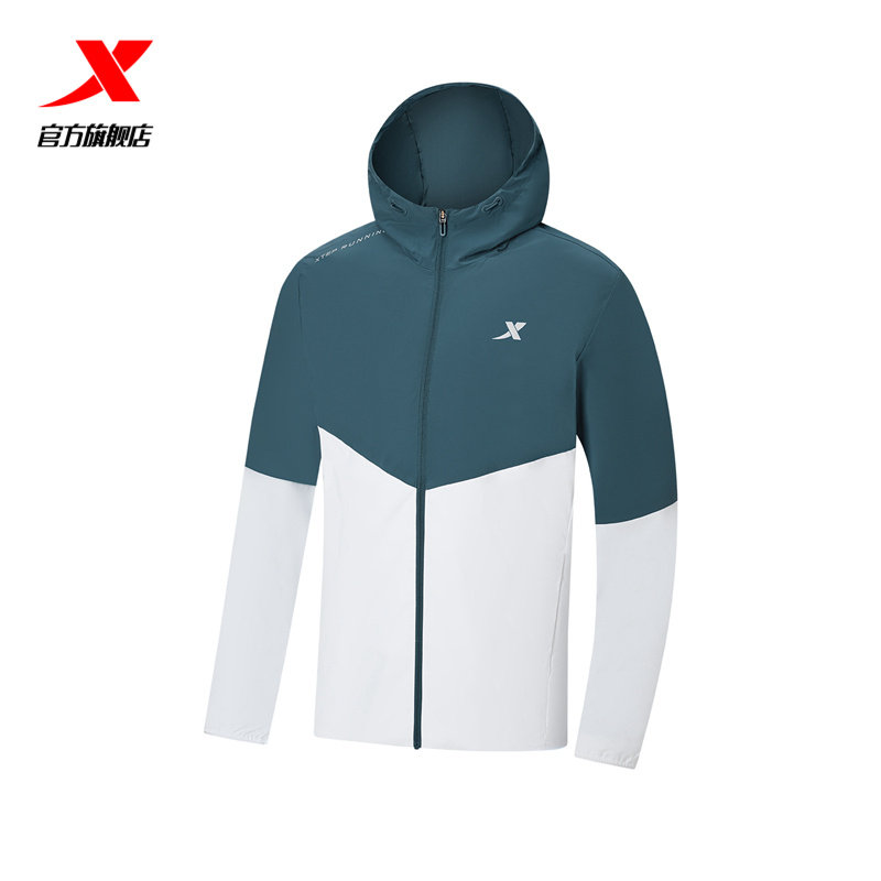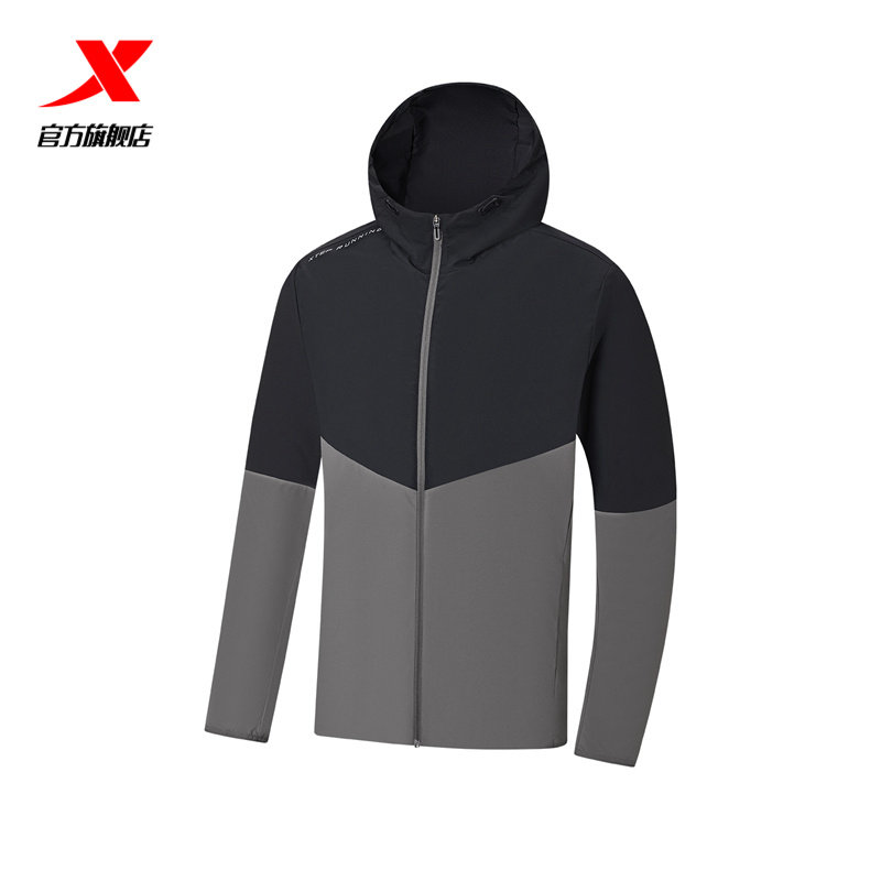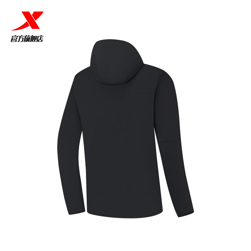 特步防泼水夹克外套男春秋季户外风衣连帽黑色上衣防风运动训练服