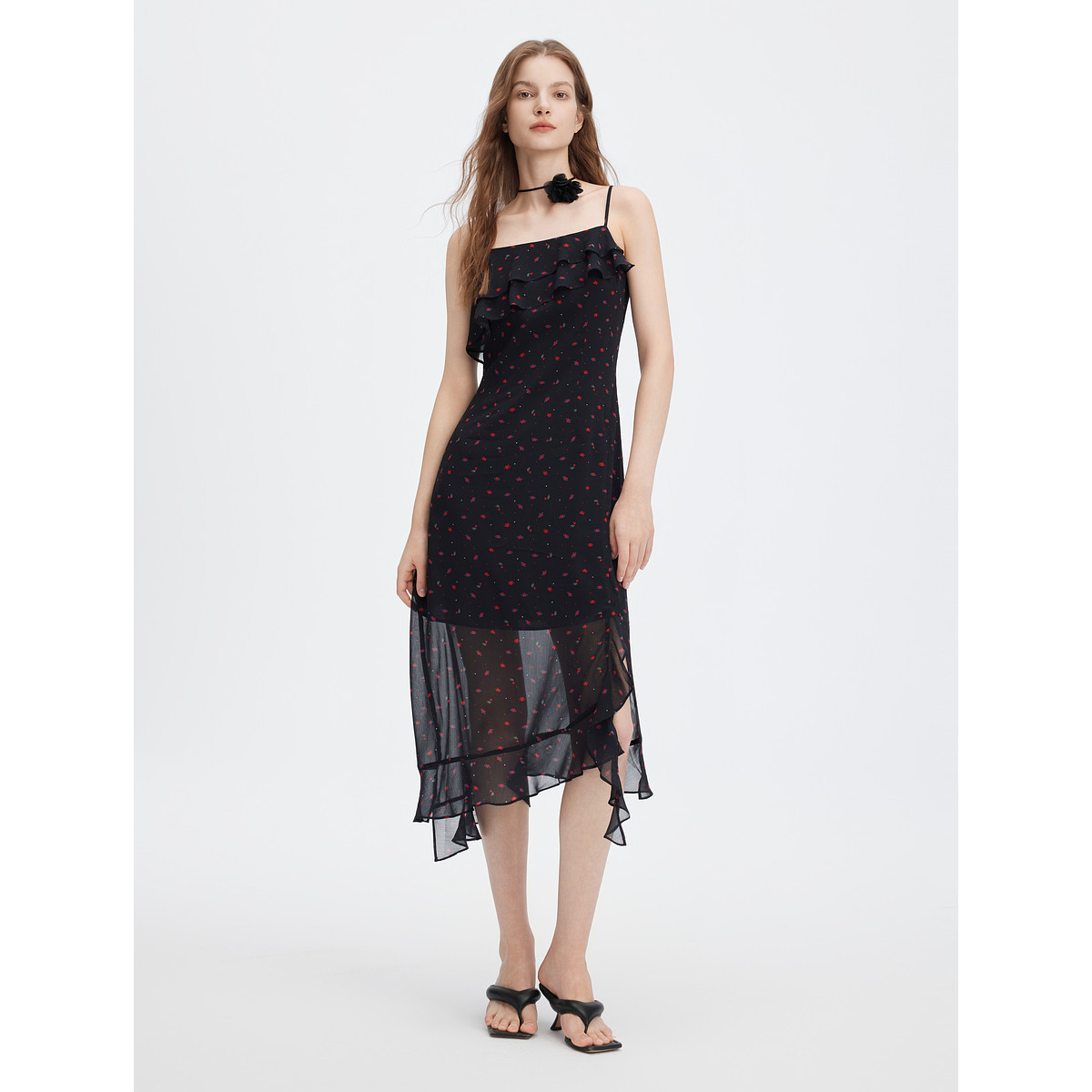 ELLE荷叶边雪纺碎花吊带连衣裙女2025秋新款垂感收腰显瘦a字长裙