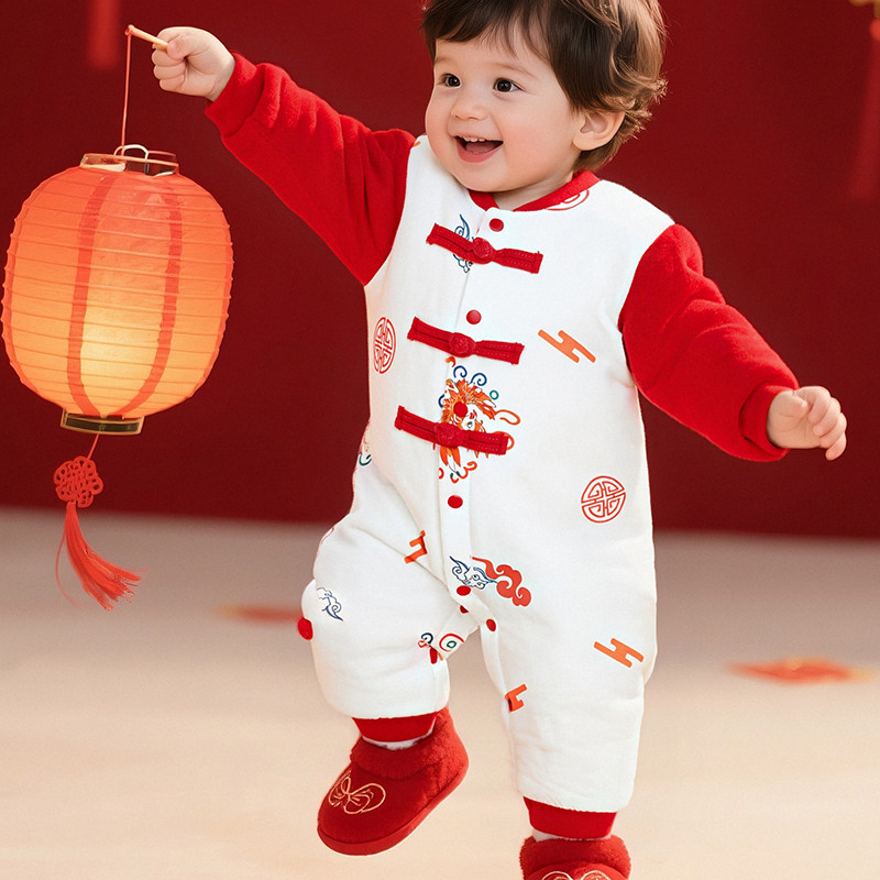 过年婴儿衣服冬季新年拜年喜庆红色连体衣男女宝宝满月百天新中式