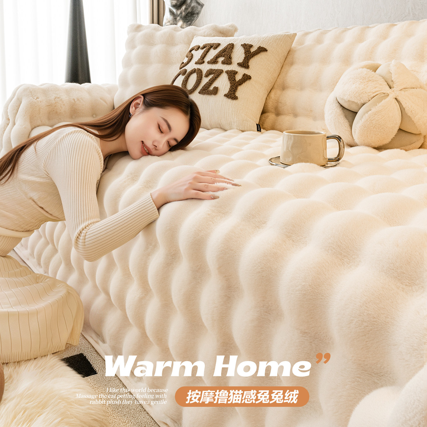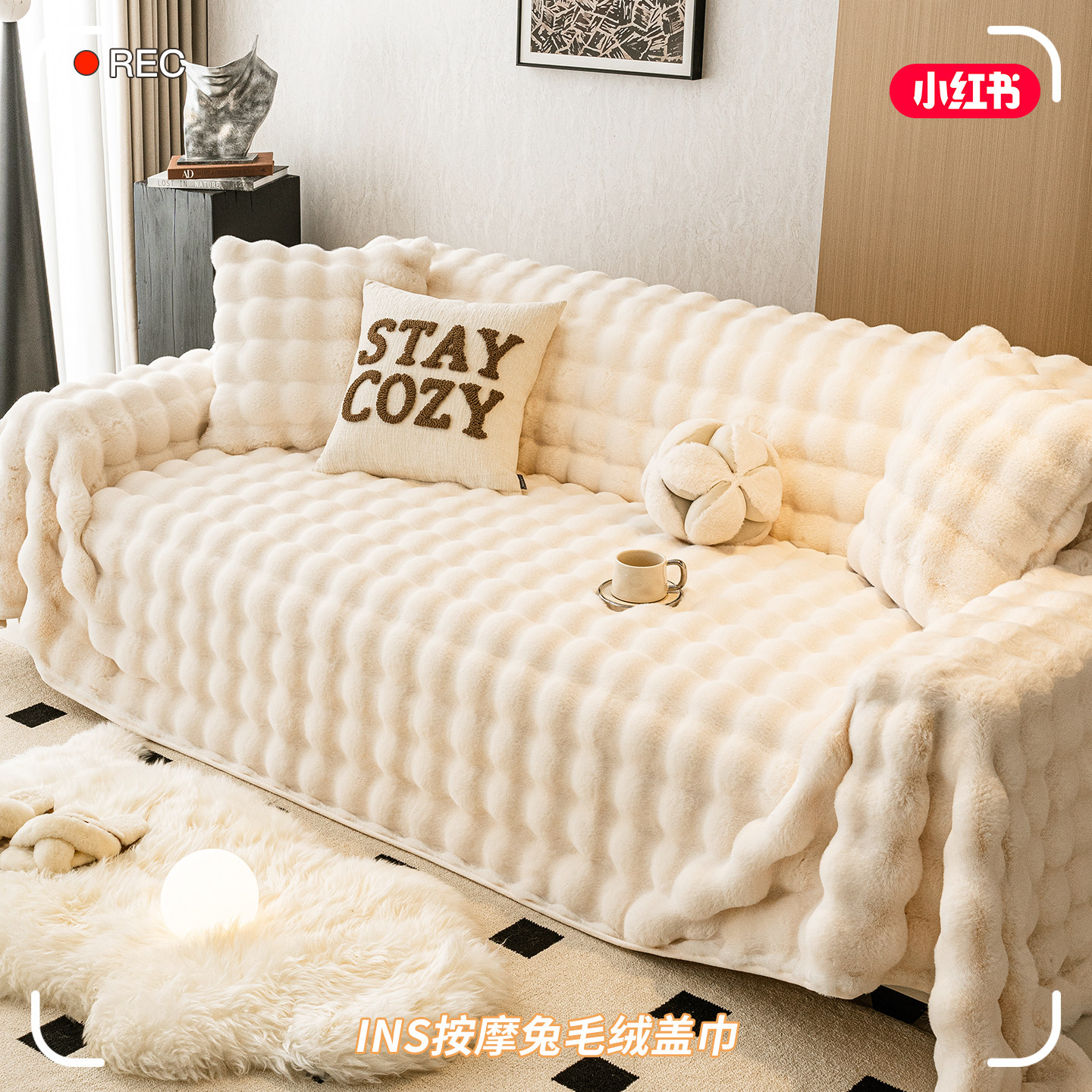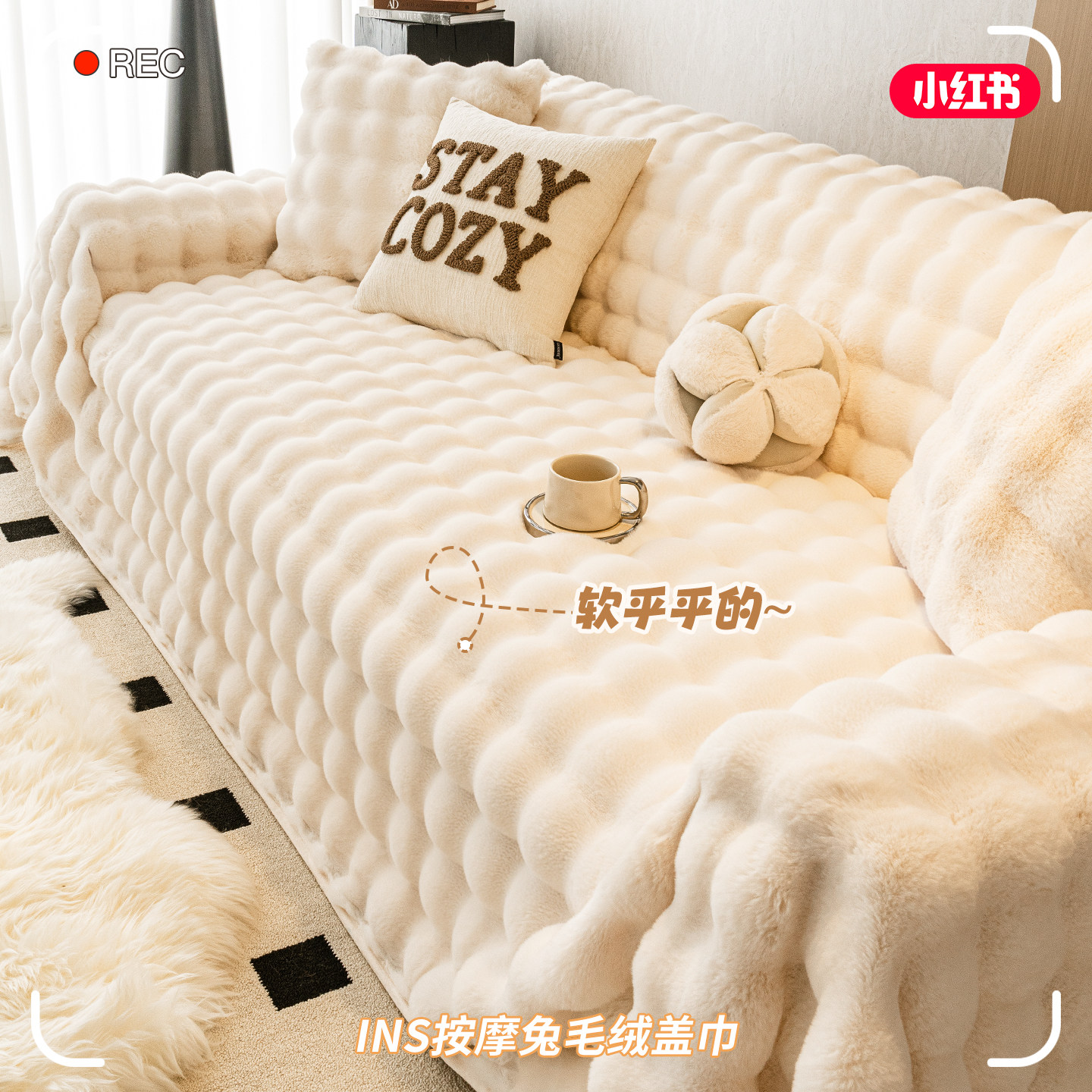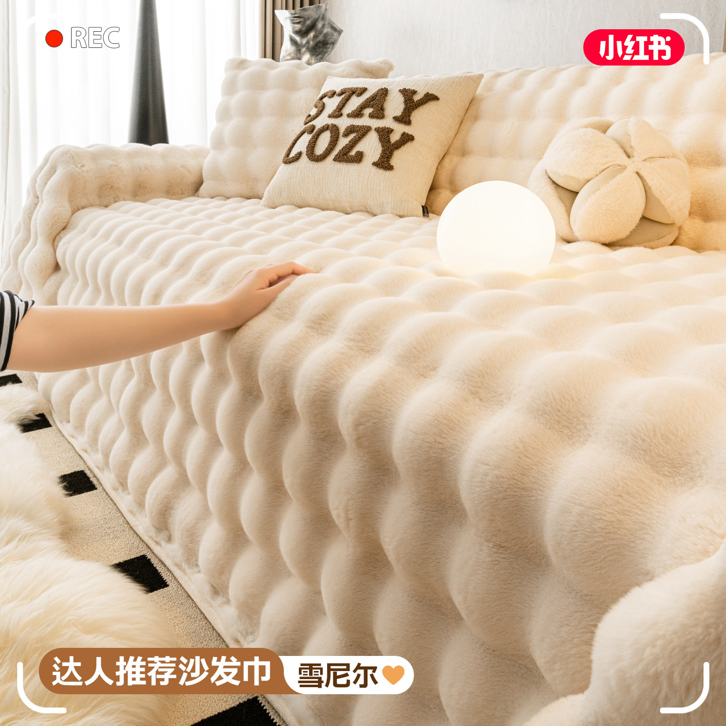 冬季加厚兔兔绒沙发盖布巾秋冬毛绒盖毯防滑坐垫套罩2025奶油红色