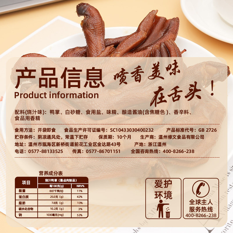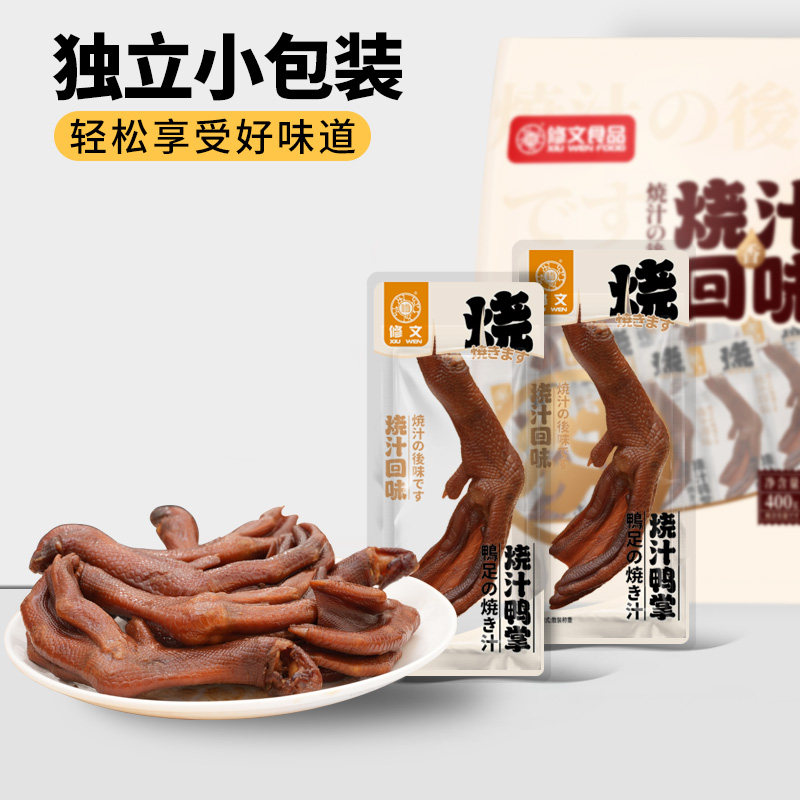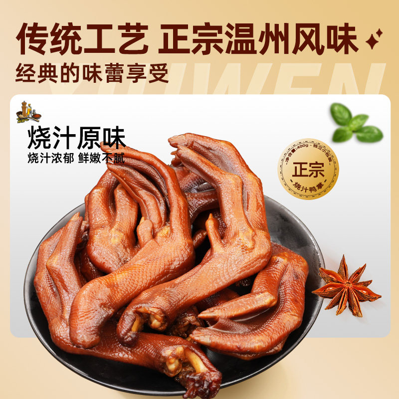 修文鸭掌温州特产烧汁鸭掌鸭爪鸭脚开袋即食熟食休闲零食净重400g