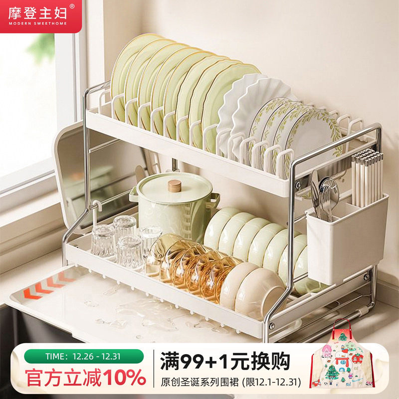 摩登主妇碗碟沥水架厨房置物架不锈钢沥水篮碗盘筷收纳架双层碗架