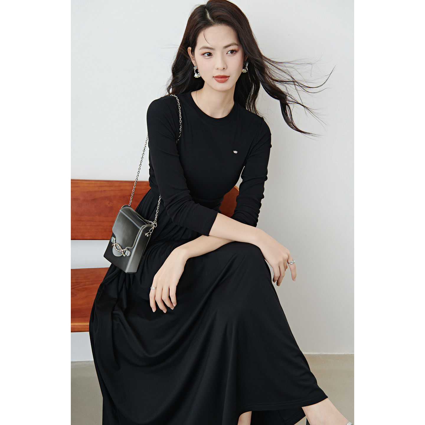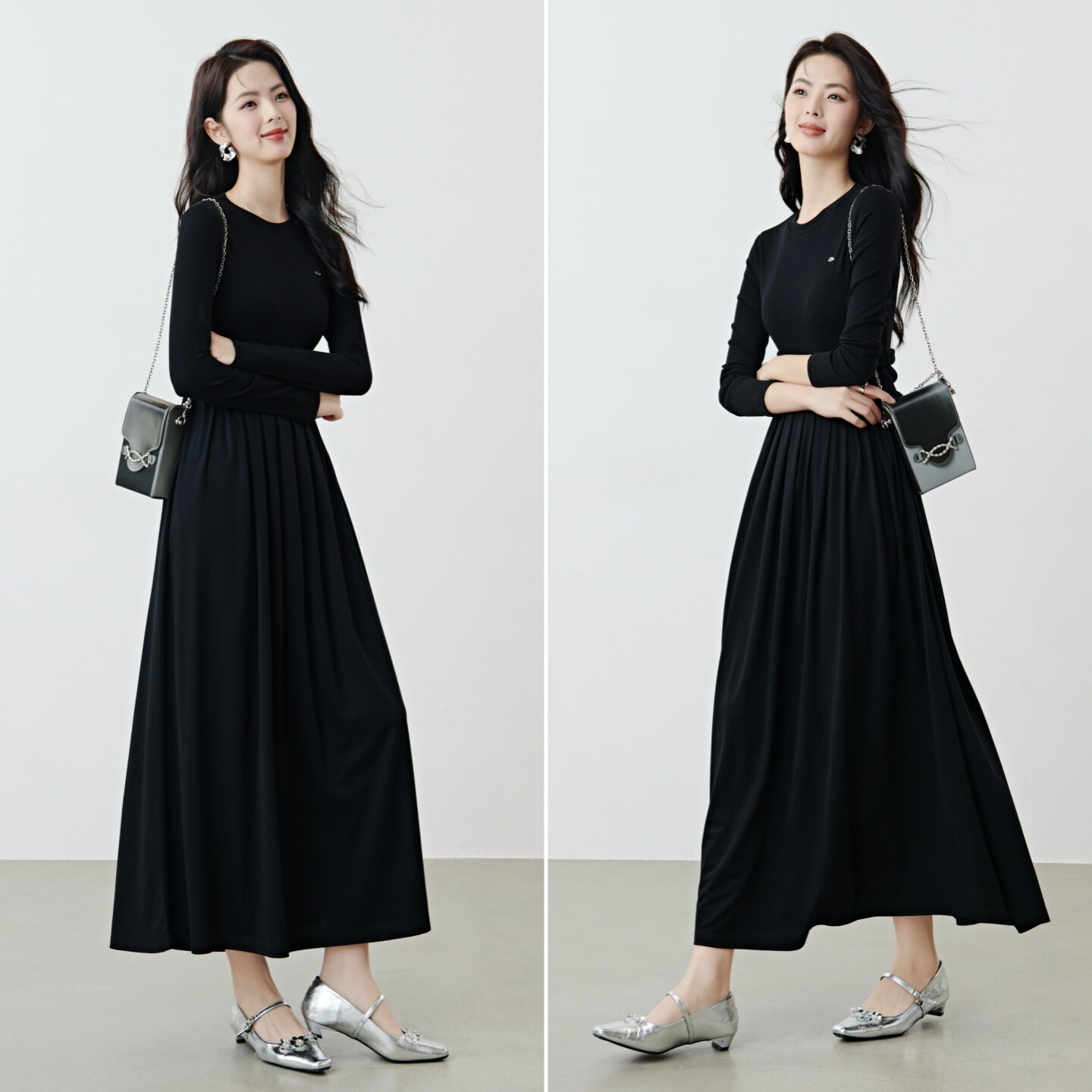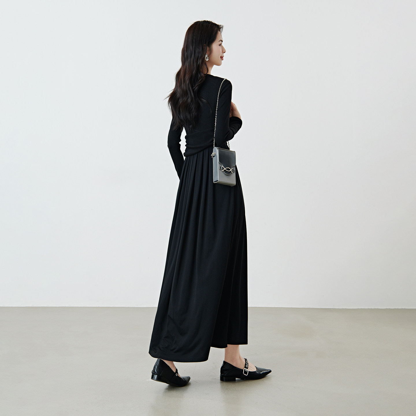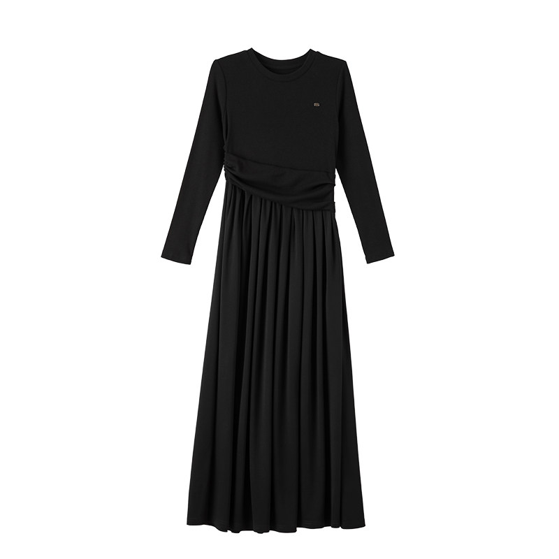 晚白2026年春新款圆领赫本风小黑裙加长版压褶不规则收腰连衣裙
