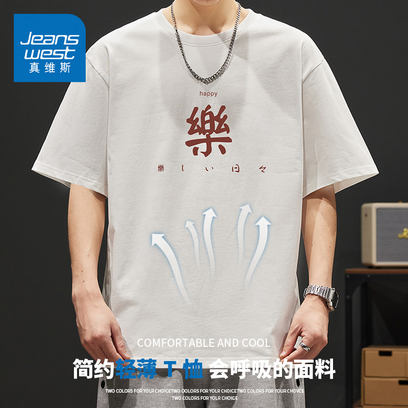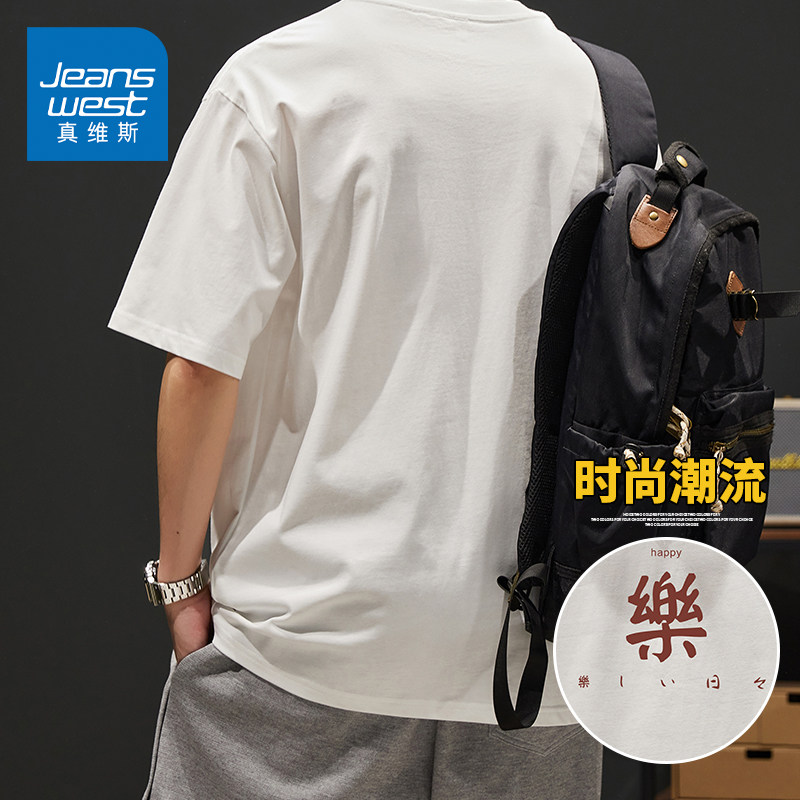 KZH真维斯白色短袖T恤男夏季新款宽松打底体恤重磅印花休闲上衣潮